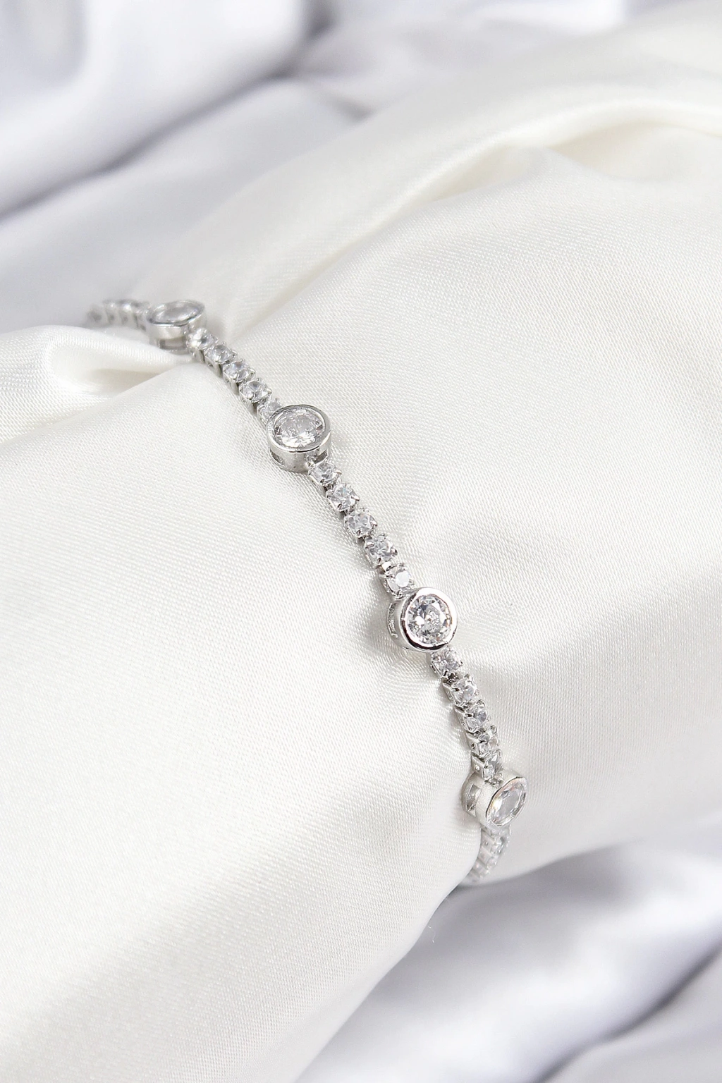 Pirinç Zirkon Taşlı Daire Model Gümüş Renk Asansörlü Kadın Bileklik - TJ-BB7744