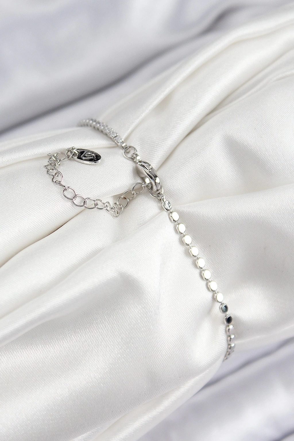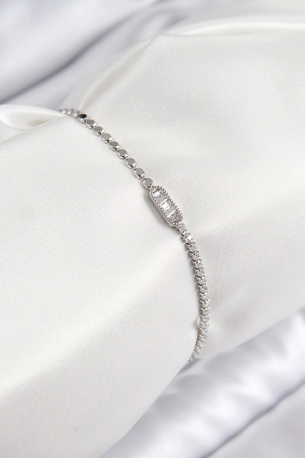 Pirinç Zirkon Taşlı Dikdörtgen Model Ezme Zincir Gümüş Renk Kadın Bileklik - TJ-BB7594