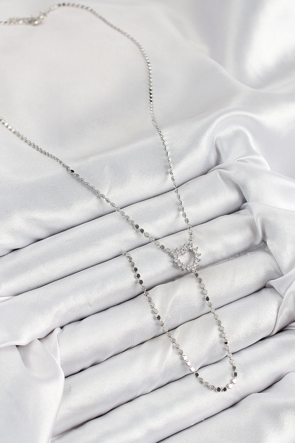 Pirinç Zirkon Taşlı Ezme Zincirli Kalp Model Gümüş Renk Y Kolye - TJ-BKO10460