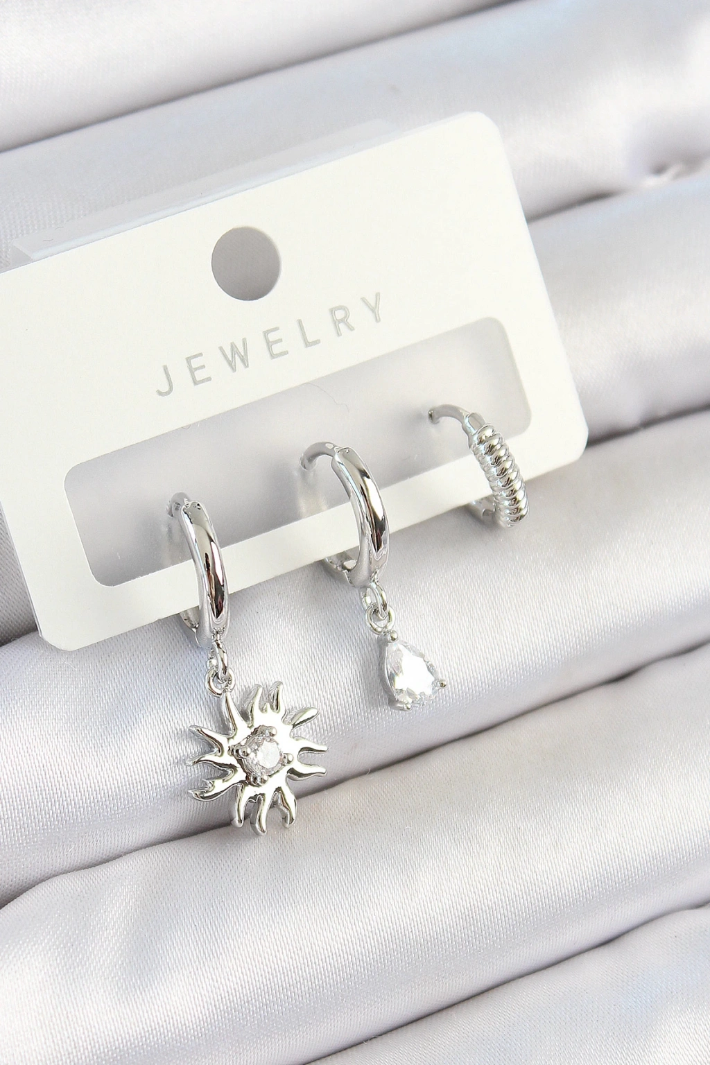 Pirinç Zirkon Taşlı Güneş Model Gümüş Renk 3'lü Çift Kadın Küpe Set - TJ-BKP10799