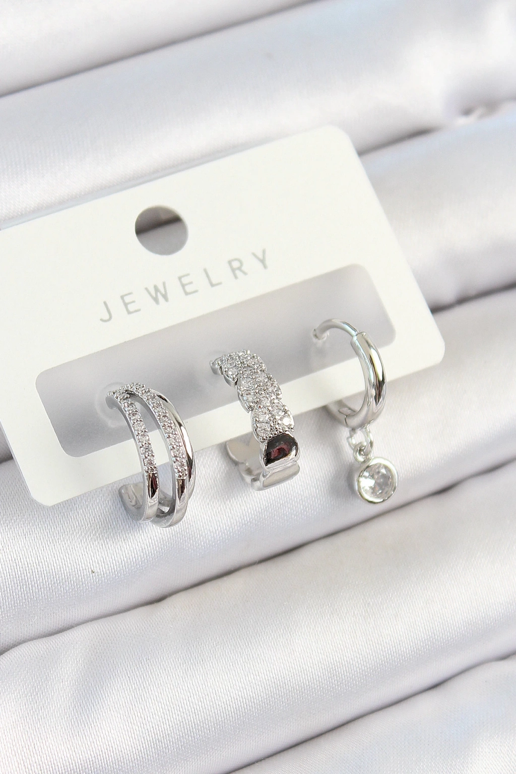 Pirinç Zirkon Taşlı Halka Model Gümüş Renk 3'lü Çift Kadın Küpe Set - TJ-BKP10800