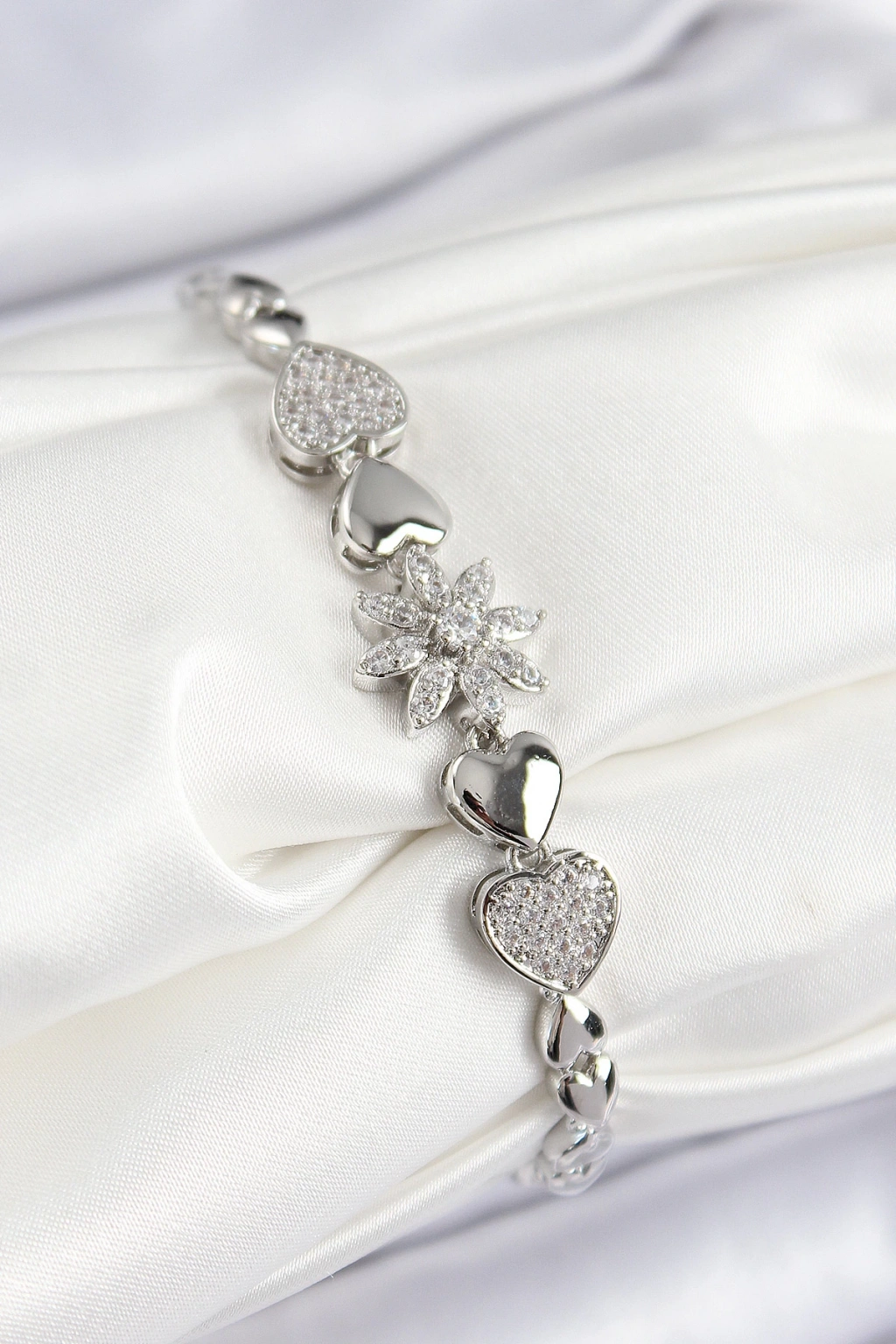 Pirinç Zirkon Taşlı Kalp Detaylı Çiçek Model Gümüş Renk Kadın Bileklik - TJ-BB7528
