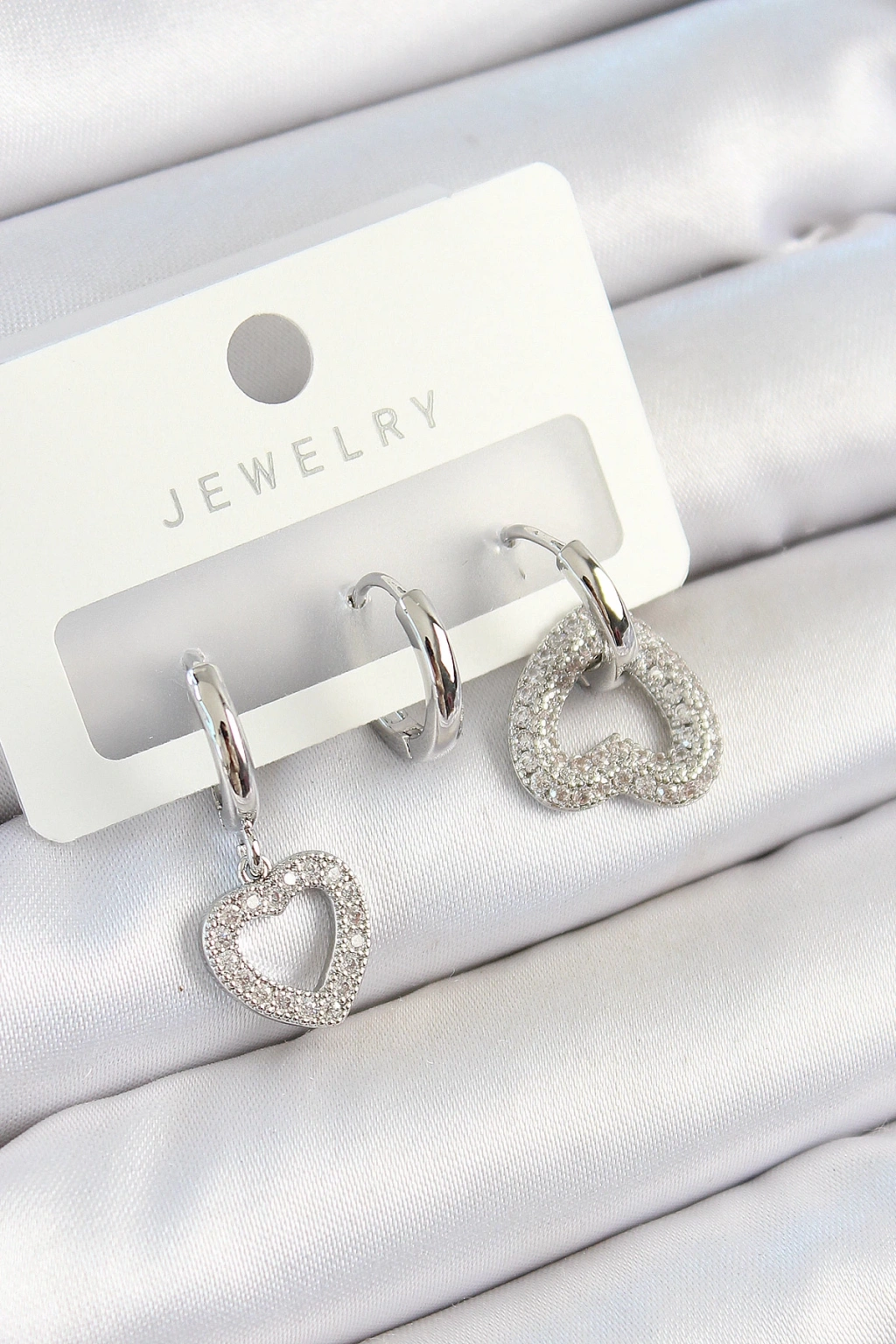 Pirinç Zirkon Taşlı Kalp Model Gümüş Renk 3'lü Çift Kadın Küpe Set - TJ-BKP10801