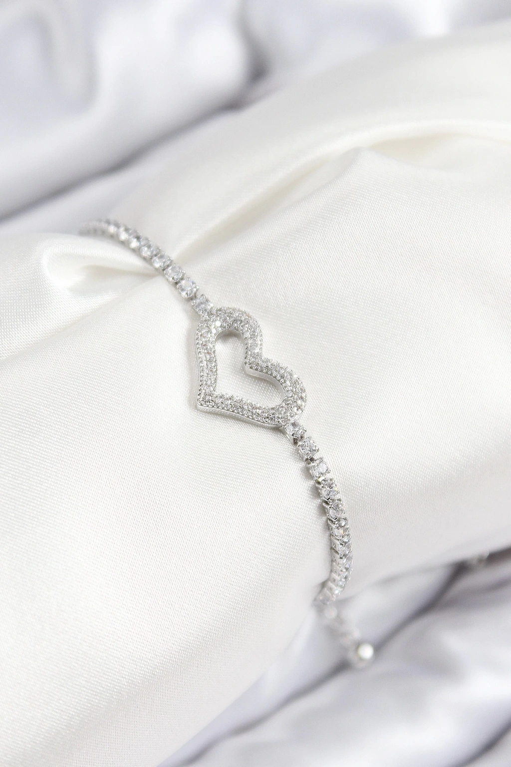 Pirinç Zirkon Taşlı Kalp Model Gümüş Renk Asansörlü Kadın Bileklik - TJ-BB7742