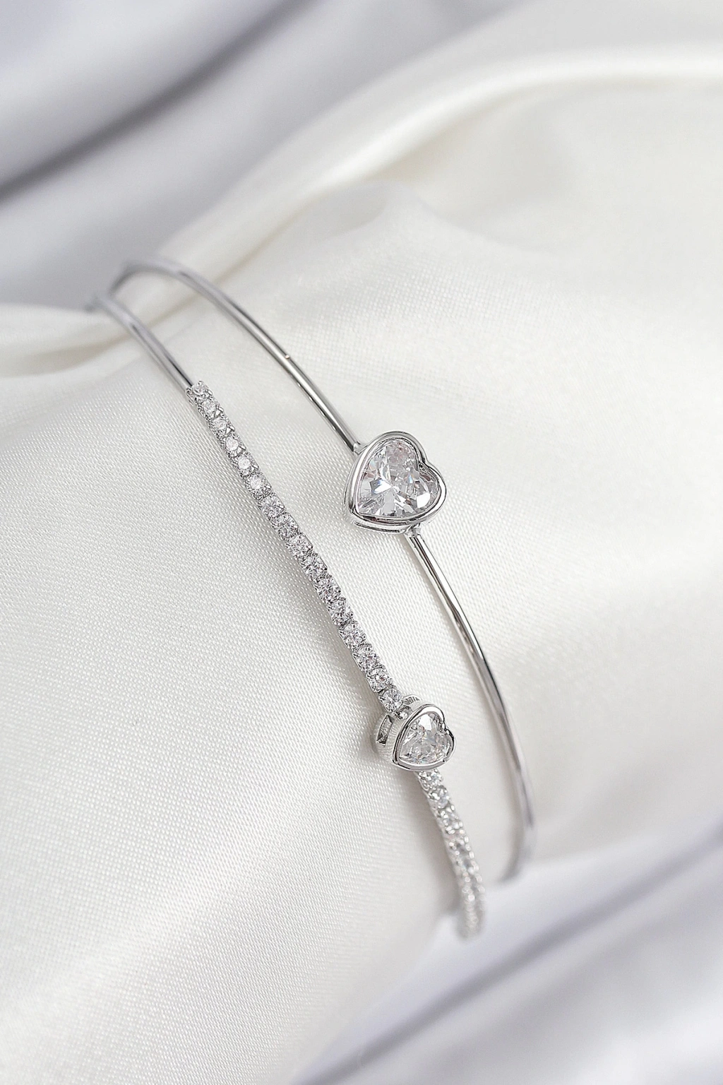 Pirinç Zirkon Taşlı Kalp Model Gümüş Renk Kadın Bileklik - TJ-BB7870