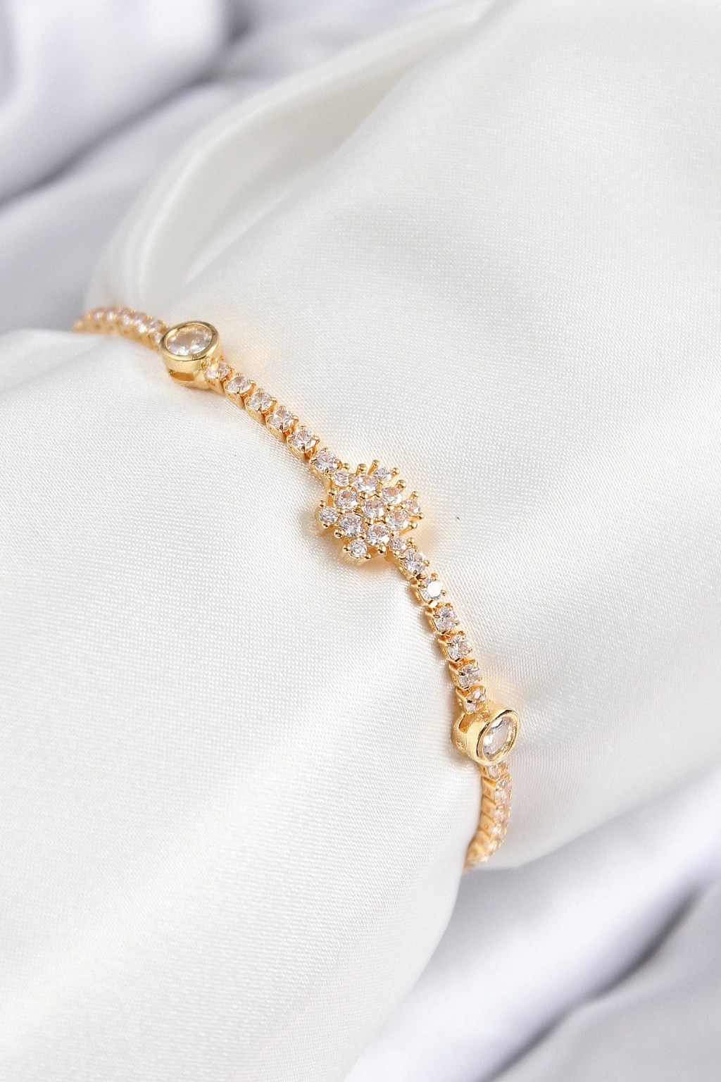 Pirinç Zirkon Taşlı Kar Tanesi Model Gold Renk Asansörlü Kadın Bileklik - TJ-BB7723