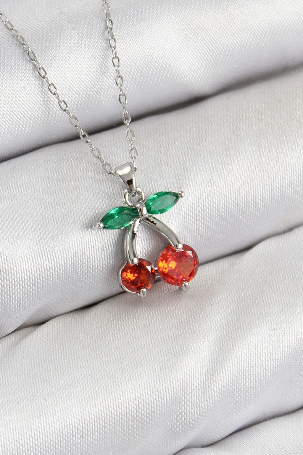 Pirinç Zirkon Taşlı Kiraz Model Gümüş Renk Kadın Kolye - TJ-BKO10421