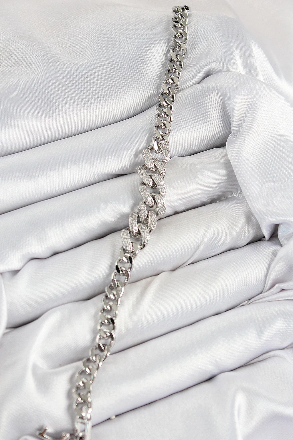 Pirinç Zirkon Taşlı Küba Zincir Model Gümüş Renk Kadın Bileklik - TJ-BB7534