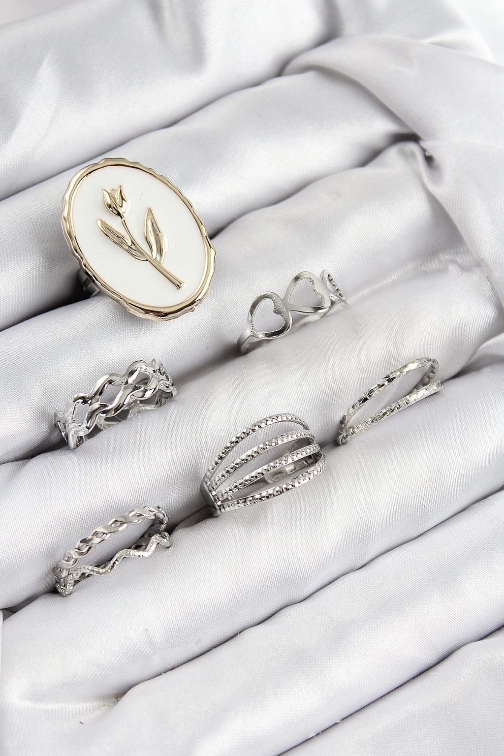Pirinç Zirkon Taşlı Lale Model Gümüş Renk Kadın Yüzük Kombin Set - TJ-BYK3824