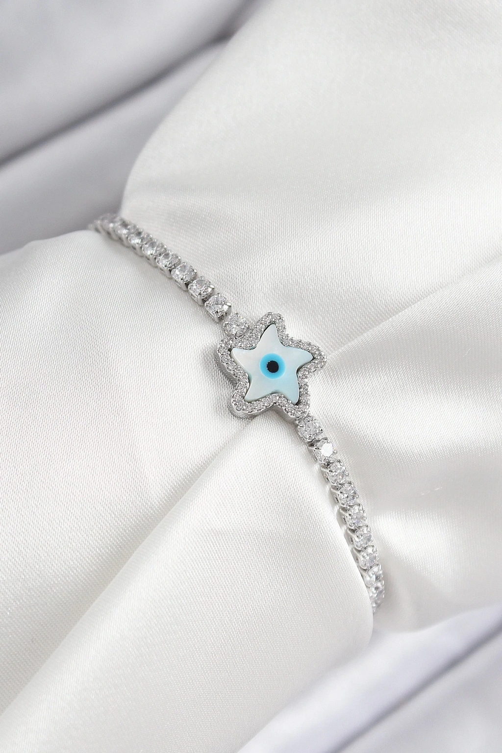 Pirinç Zirkon Taşlı Nazar Yıldız Model Gümüş Renk Asansörlü Kadın Bileklik - TJ-BB7469