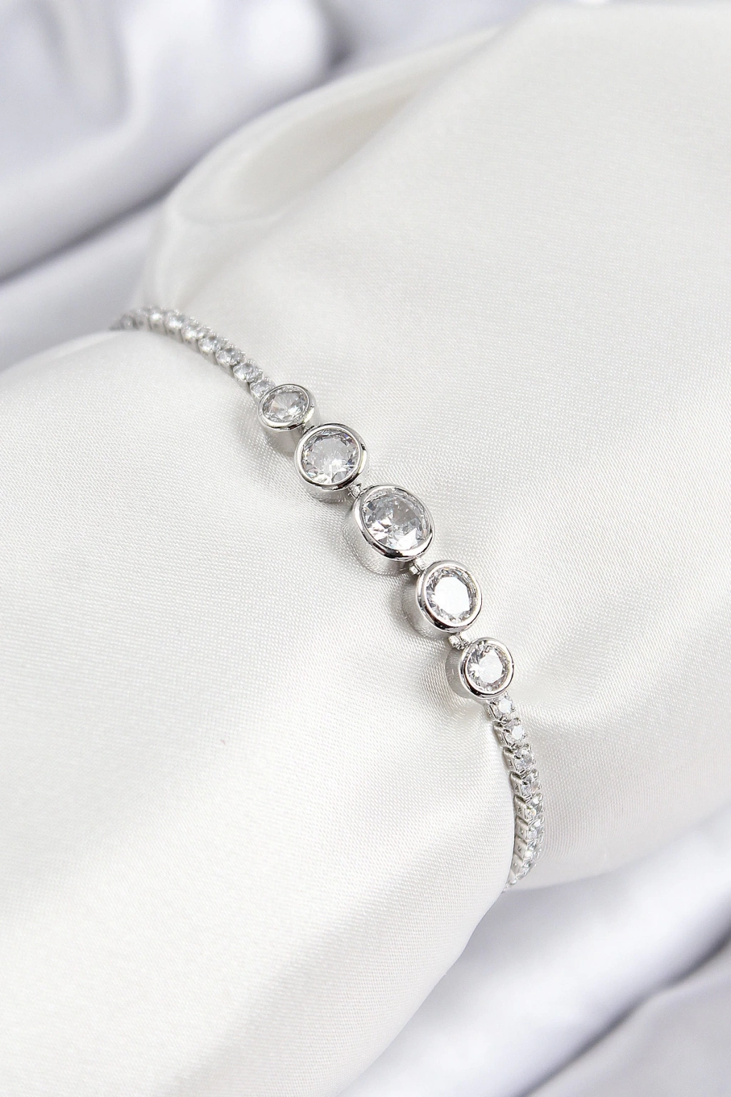 Pirinç Zirkon Taşlı Sıralı Daire Model Gümüş Renk Asansörlü Kadın Bileklik - TJ-BB7718