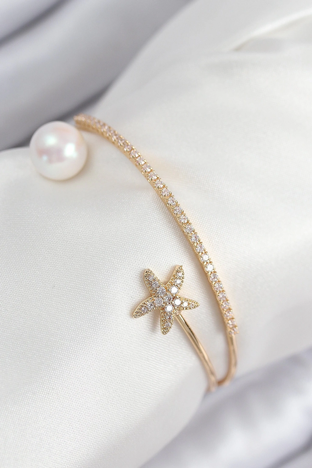 Pirinç Zirkon Taşlı Yıldız Ve İnci Model Gold Renk Kadın Bileklik - TJ-BB7883