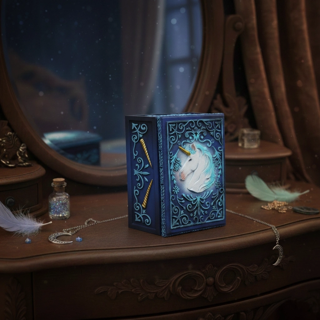 POLYESTER UNICORN KUTUÜrün ÖzellikleriPolyester Unicorn Kutu, mistik ve büyüleyici tasarımıyla dikkat çeken özel bir saklama kutusudur. Üzerindeki detaylı unicorn figürü ve kabartmalı süslemeleri ile dekoratif bir obje olarak da kullanılabilir. Kaliteli polyester malzemeden üretilmiş olup, dayanıklı ve uzun ömürlüdür. Takı, küçük eşyalar veya özel eşyalarınızı saklamak için ideal bir seçimdir. Canlı renkleri ve zarif detaylarıyla çocuk odalarından oturma odalarına kadar her ortamda şık bir görünüm sunar.Paket İçeriği1 Adet Polyester Unicorn Kutu