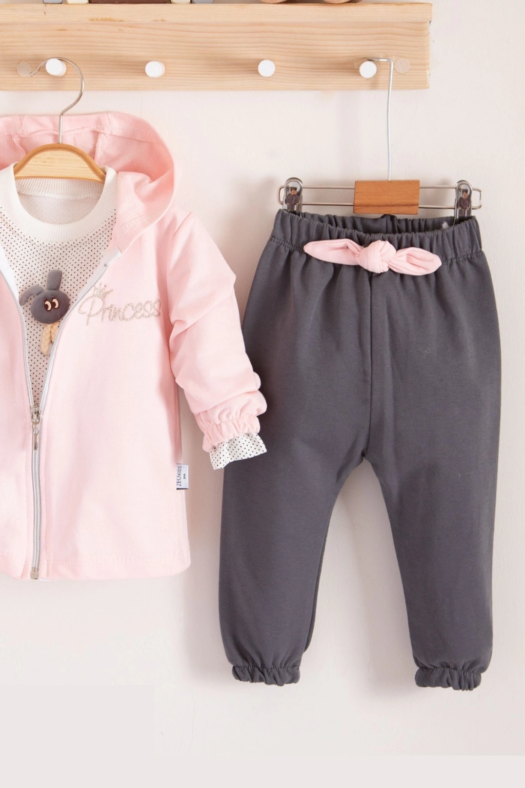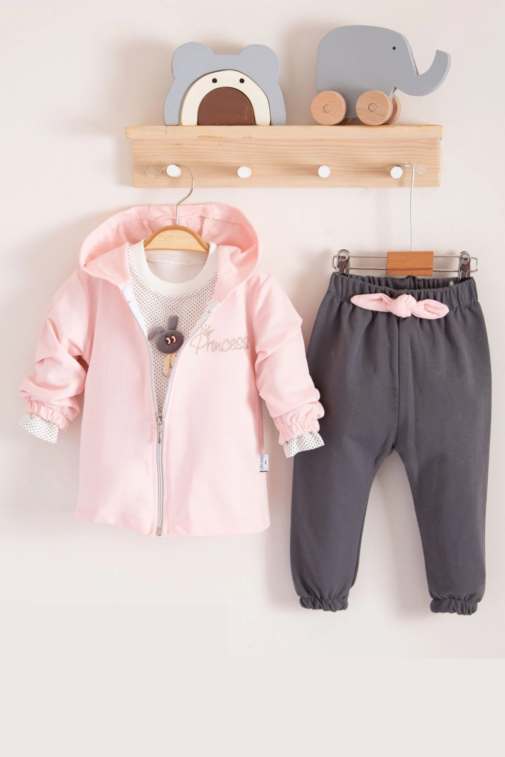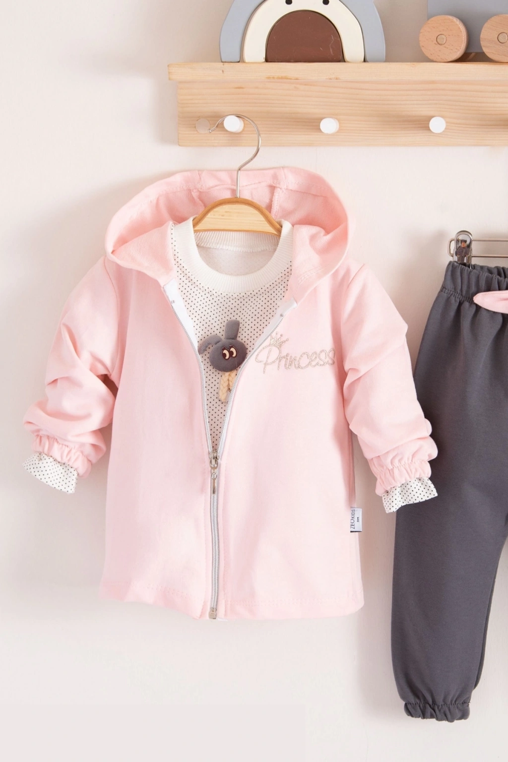 Prences Nakışlı Kapişonlu 3'lü % 100 Pamuk Kız Bebek Takımı