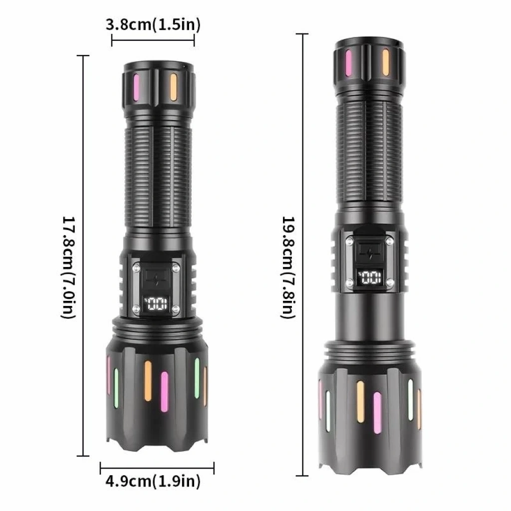 Marka: Model: 9954 LED: TG Ölçüleri: 17.8*4.9*3.8CM Net Ağırlık: 243G Malzeme: Alüminyum Düğme: Tek Düğme Batarya: 1*18650/1*26650/3*AAA Şarj Yöntemi: Type-C USB Şarj Zoom: Telescopic Zoom
