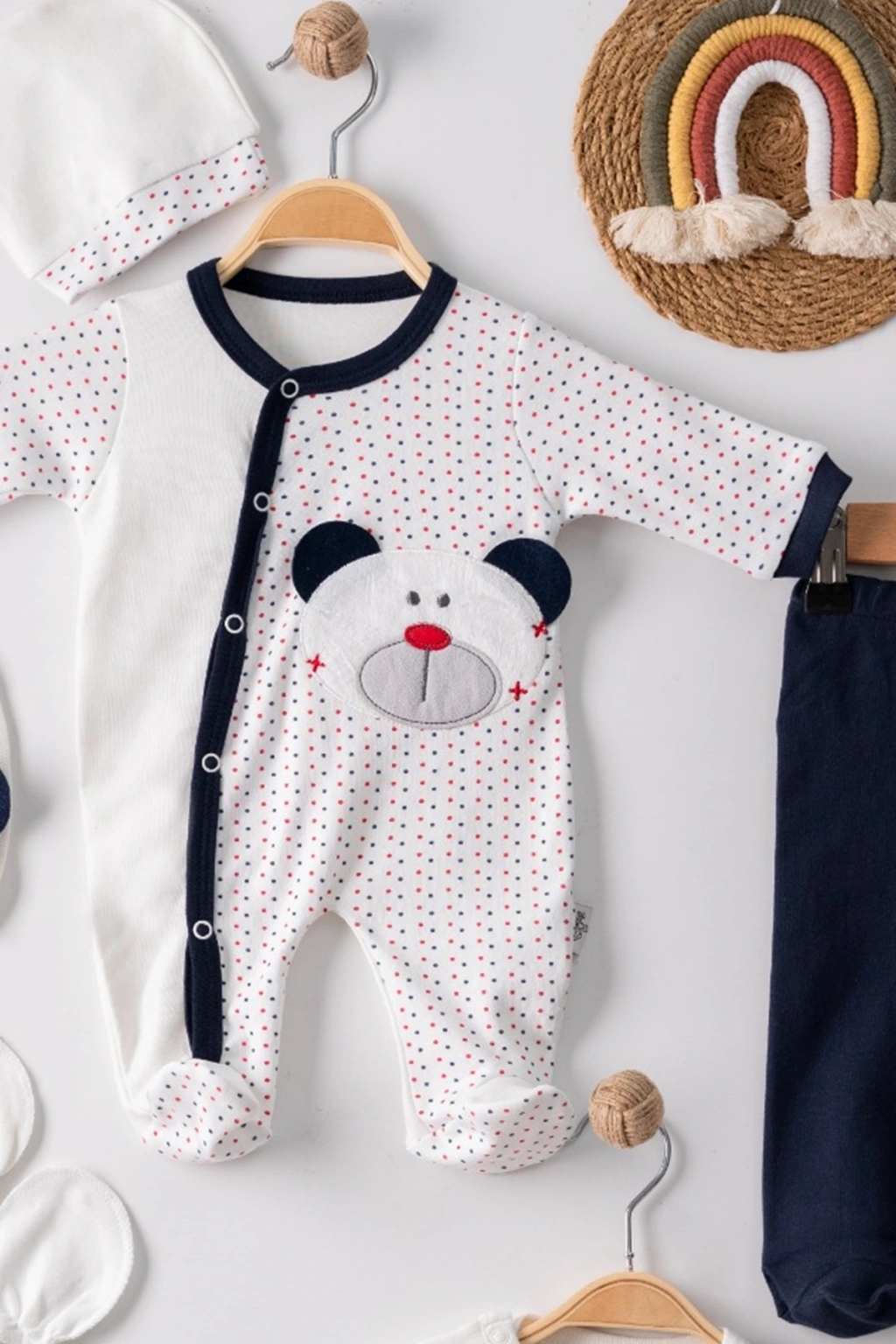 Puanlı Ayıcık Nakışlı Tulumlu % 100 Pamuk Erkek Bebek 5'li Set