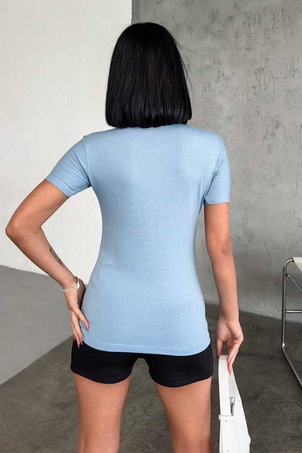 -Bebe mavisi rengi, sakin ve taze bir görünüm sunarak her mevsim ve her durumda mükemmel bir stil oluşturmanızı sağlar. Kısa kollu tasarımı, sıcak havalarda serin kalmanıza yardımcı olurken, bisiklet yaka detayı da görünümünüze modern bir dokunuş katar.