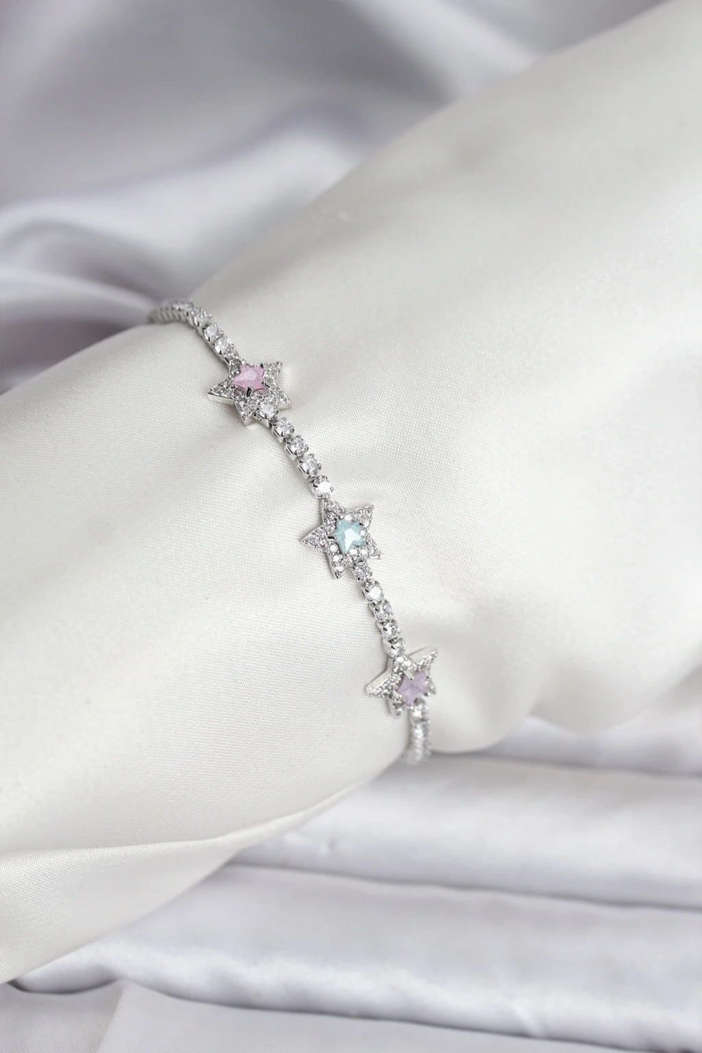 Renkli Yıldız Model Zirkon Taşlı Gümüş Renk Pirinç Su Yolu Kadın Bileklik - TJ-BB8101