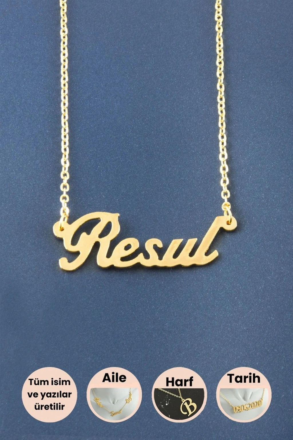 Resul İsimli Kolye; İsimli kolye pirinç madeninden ve altın kaplamalıdır. Kişiye özel üretilmektedir. Yazdırmak istediğiniz ismi bize mesaj olarak iletmeniz gerekmektedir. Kullanıma bağlı olarak uzun süre kullanıma uygundur. Ürün malzemesi 1.sınıf kalitededir. Ürün ve zinciri sarı renktedir. Ürün zincir boyu 45 cm ve ürün üzerindeki isimler yaklaşık 3 cmdir. İsim boyları ürün ismine göre degişiklik göstermektedir.