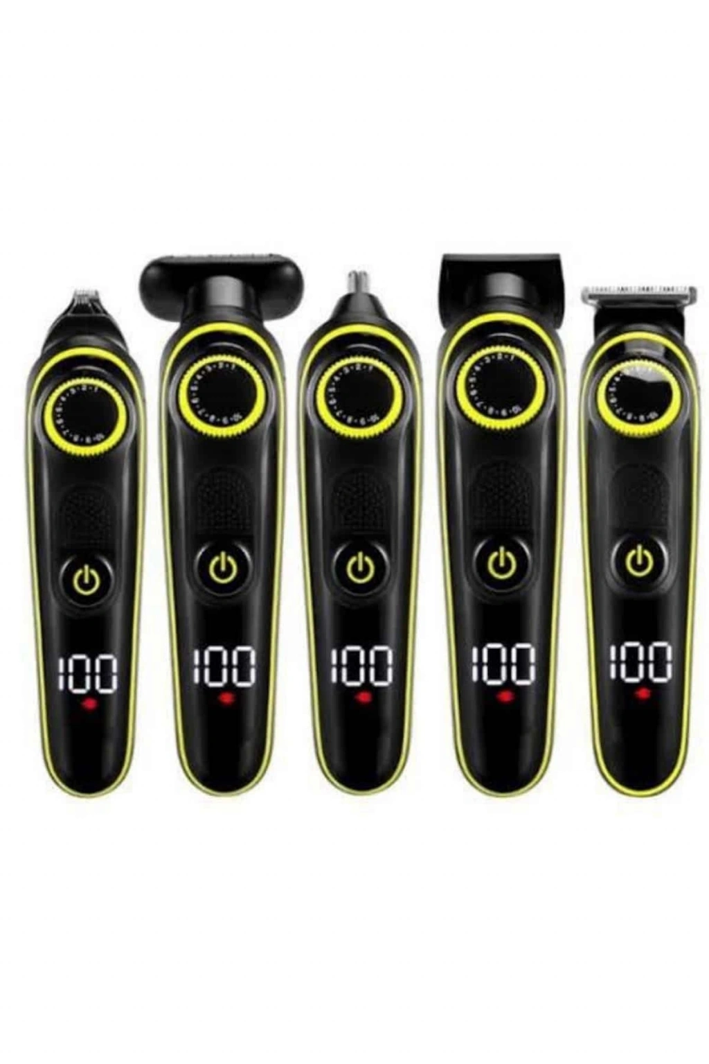 Bu 5'i 1 arada çok fonksiyonlu bakım seti, kişisel bakım rutininizi daha pratik ve etkili hale getiriyor. Saç kesimi, sakal tıraşı, burun ve kulak kılı temizliği, detaylı şekillendirme ve vücut tıraşı gibi birden fazla işlevi tek cihazda sunarak, tam kapsamlı bakım imkanı sağlıyor. Güçlü motoru ve paslanmaz çelik bıçakları ile pürüzsüz bir tıraş deneyimi sunarken, uzun ömürlü ve keskin yapısı sayesinde her kullanımda yüksek performans elde edebilirsiniz. Kablosuz ve şarjlı kullanımı sayesinde hareket özgürlüğü tanır; tam dolu batarya ile uzun süreli kullanım imkanı sunar. Farklı kesim uzunlukları için ayarlanabilir tarak başlıkları mevcuttur; bu sayede kişisel stilinize uygun şekillendirmeyi zahmetsizce gerçekleştirebilirsiniz. Ergonomik tutuşa sahip şık ve modern tasarımı, hem kullanım kolaylığı sağlar hem de banyo alanınıza es bir katkı sunar. Üzerindeki LED gösterge, pil seviyesini anlık olarak takip etmenize olanak tanırken, düşük sesli çalışması ile her ortamda konforlu bir kullanım deneyimi yaşatır. Suya dayanıklı başlıkları ve çıkarılabilir bıçakları sayesinde temizlik işlemleri oldukça kolaydır; hijyenik kullanım için yalnızca düzenli olarak yıkamanız yeterlidir.