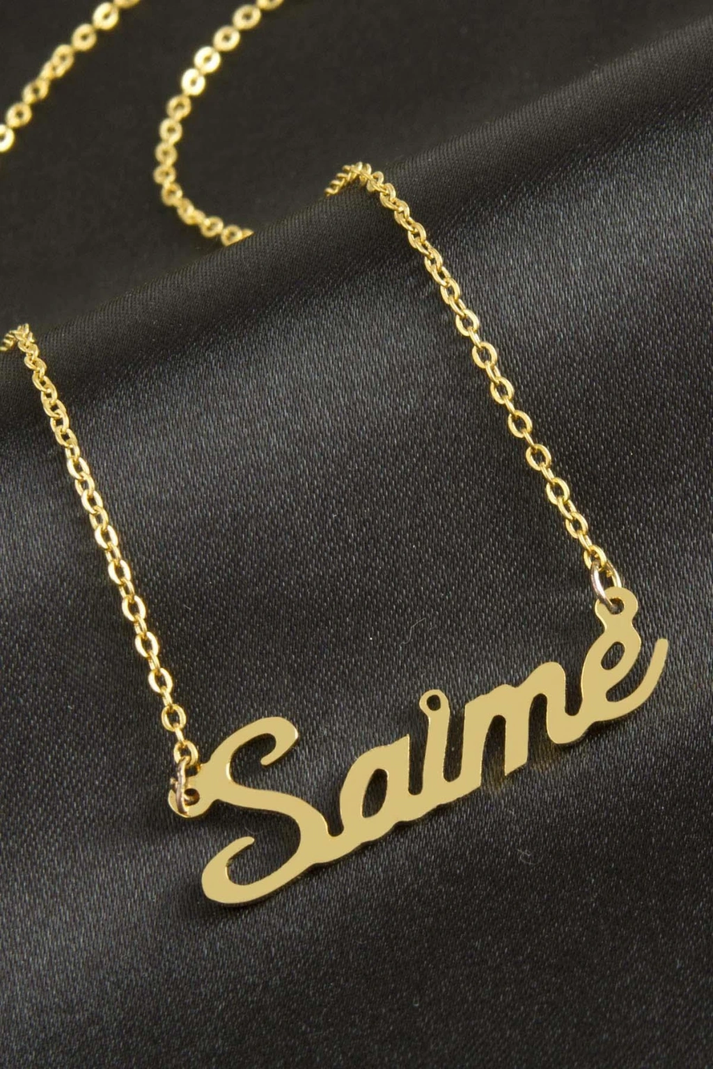 Saime isimli kolye. İsimli kolye pirinç madeninden ve altın kaplamalıdır. Kişiye özel üretilmektedir.Yazdırmak istediğiniz ismi bize mesaj olarak iletmeniz gerekmektedir. Kullanıma bağlı olarak uzun süre kullanıma uygundur. Ürün malzemesi 1.sınıf kalitededir. Ürün ve zinciri sarı renktedir. Ürün zincir boyu 45 cm ve ürün üzerindeki isimler yaklaşık 3 cmdir. İsim boyları ürün ismine göre degişiklik göstermektedir.