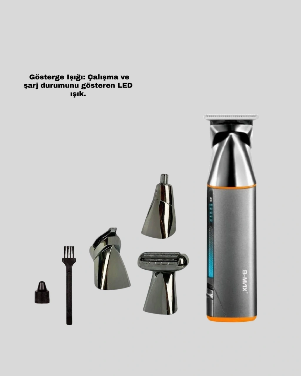 9’u 1 arada erkek bakım cihazı, geniş başlık seçenekleri ile saç, sakal ve vücut bakımını tek cihazda toplar. Paslanmaz bıçak yapısı uzun kullanım ömrü sunarken güçlü motoru hızlı ve etkili kesim sağlar.USB ile şarj edilebilmesi, cihazı her ortamda pratik şekilde kullanmanıza olanak tanır. Full şarjda yaklaşık 90 dakika kullanım sunar. LED gösterge ışığı, şarj sürecini ve çalışma durumunu kolayca takip etmenize yardımcı olur.Set içeriğindeki saç kesme başlığı, sakal düzeltici başlık, favori başlığı ve carving bıçağı ile farklı tarzlar oluşturabilir, burun–kulak başlığı ile tam hijyen sağlayabilirsiniz. 4 farklı saç kesim tarağı sayesinde istediğiniz uzunlukta kesim yapabilirsiniz.Yıkanabilir başlıkları, taşınabilir tasarımı ve saklama çantasıyla tamamlanan bu set, günlük bakımını profesyonel şekilde yapmak isteyenlere ideal çözümdür.