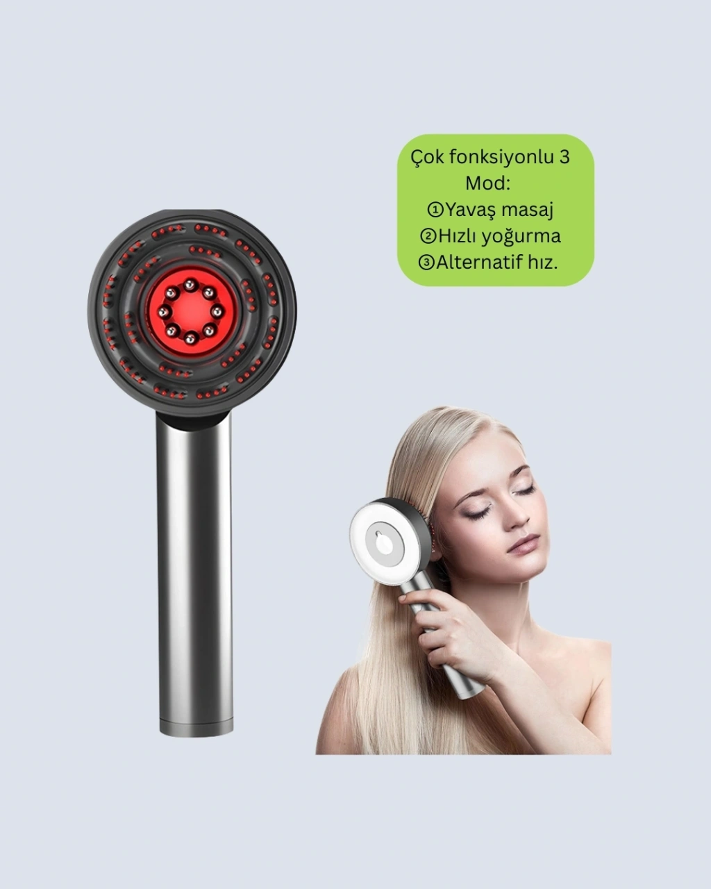 Saç bakımını profesyonel seviyeye taşıyan bu masaj tarağı, kırmızı ışık, mikro akım ve titreşim teknolojilerini bir arada sunar. 630 nm LED ışık saç derisini canlandırır, saç köklerini güçlendirir ve saç dökülmesini azaltmaya yardımcı olur.3 masaj modu sayesinde farklı saç derisi ihtiyaçlarına uyum sağlar. 72 yuvarlak uçlu tarak dişi saçların dolaşmasını önler ve nazik bir masaj sunar. Esansiyel yağ haznesi sayesinde bakım yağları kontrollü şekilde uygulanır.