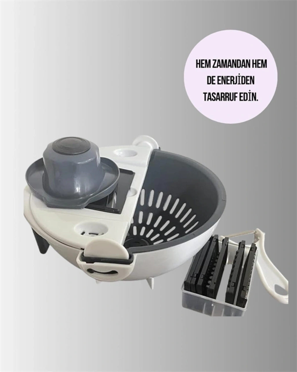 Mutfakta zaman kazanmak isteyen herkesin ihtiyaç duyacağı pratik bir yardımcı olan bu rende ve dilimleyici seti, çok yönlü kullanım imkanı sunar. Döner mekanizması sayesinde farklı bıçak türleri arasında kolayca geçiş yapılabilir. Sebzeleri ister ince ister kalın rendeleyebilir, yuvarlak ya da şerit şeklinde dilimleyebilirsiniz. Hazneli yapısı sayesinde doğradığınız malzemeler doğrudan içinde toplanır. Alt kısmında bulunan süzgeç özelliği, yıkanan sebzelerin suyunu kolayca boşaltmanıza imkan verir. Kaymaz tabanı ve el koruma atı sayesinde hem güvenli hem de konforlu bir kullanım sunar.