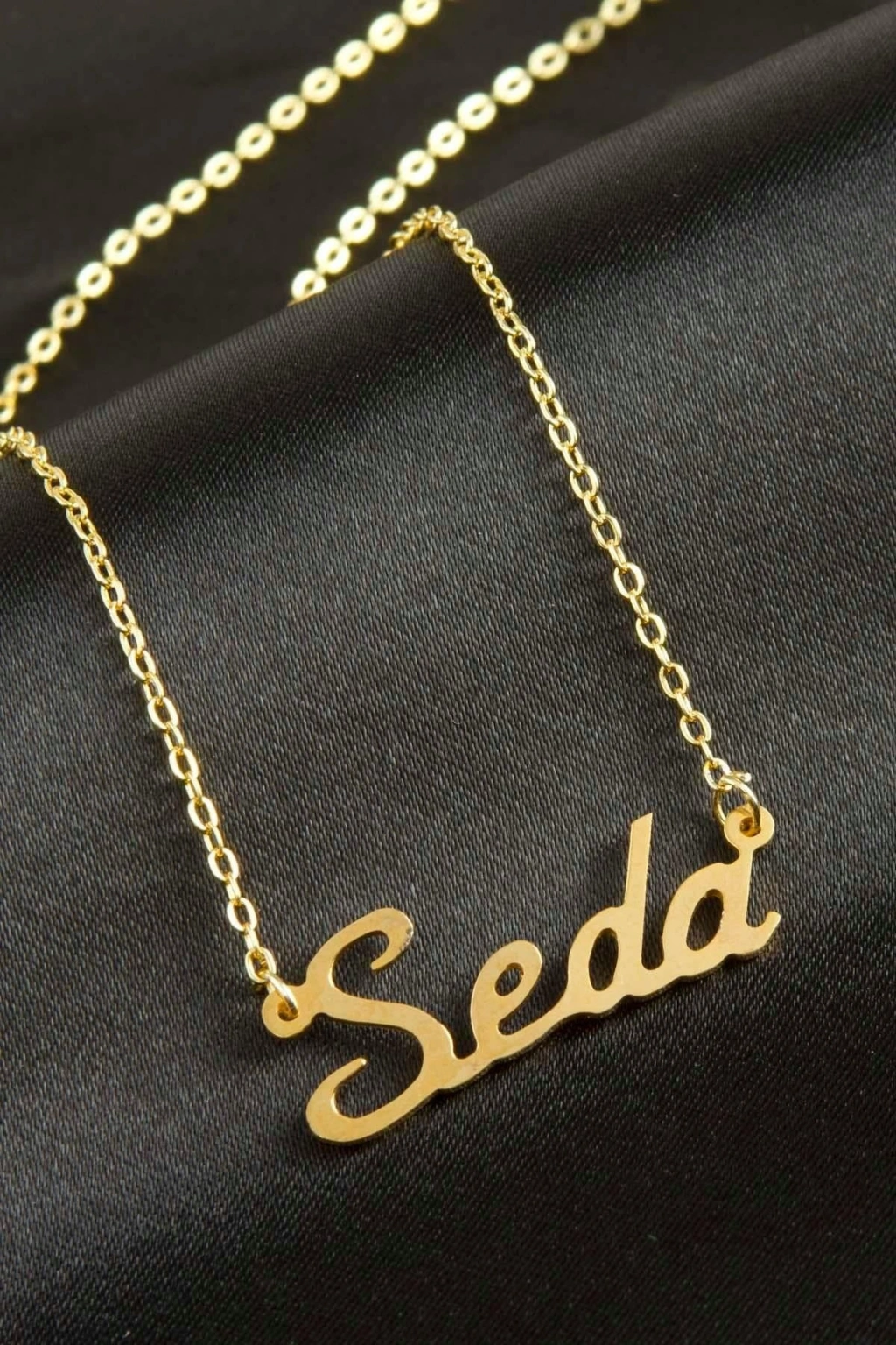 Seda isimli kolye. İsimli kolye pirinç madeninden ve altın kaplamalıdır. Kişiye özel üretilmektedir.Yazdırmak istediğiniz ismi bize mesaj olarak iletmeniz gerekmektedir. Kullanıma bağlı olarak uzun süre kullanıma uygundur. Ürün malzemesi 1.sınıf kalitededir. Ürün ve zinciri sarı renktedir. Ürün zincir boyu 45 cm ve ürün üzerindeki isimler yaklaşık 3 cmdir. İsim boyları ürün ismine göre degişiklik göstermektedir.