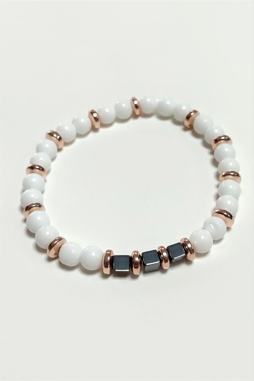 Bileklik; Ürün malzemesi hematit ve sedef taşı kullanılmıştır. Ürün taş boyu 6 mmdir. Toplam 60 adet taş bulunmaktadır.