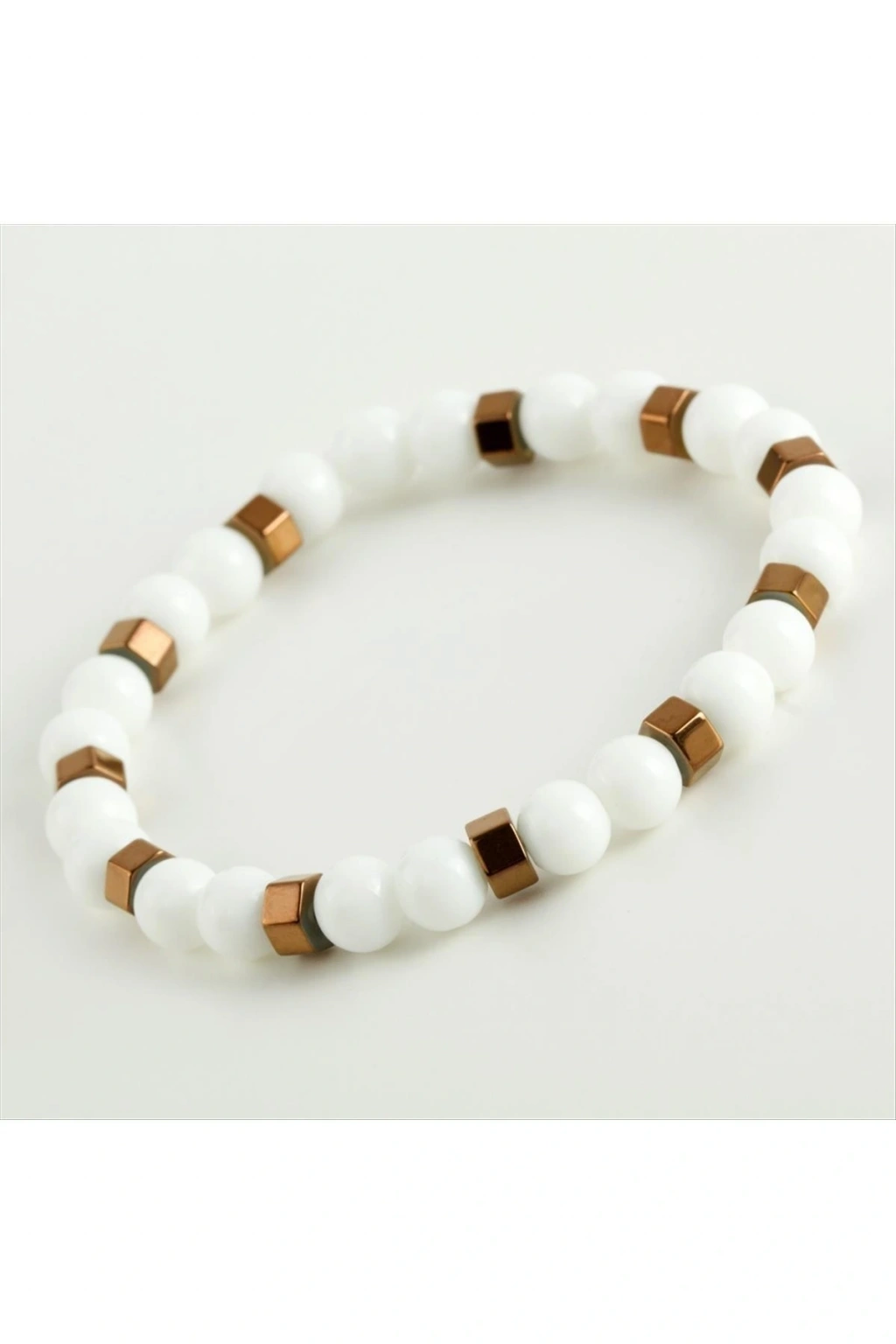 Doğaltaş Bileklik; Ürün malzemesi hematit ve mat onix doğaltaştan imal edilmiştir. Ürün malzemesi misina üzerine dizilmiştir. Ürün taş boyları 6 mmdir.