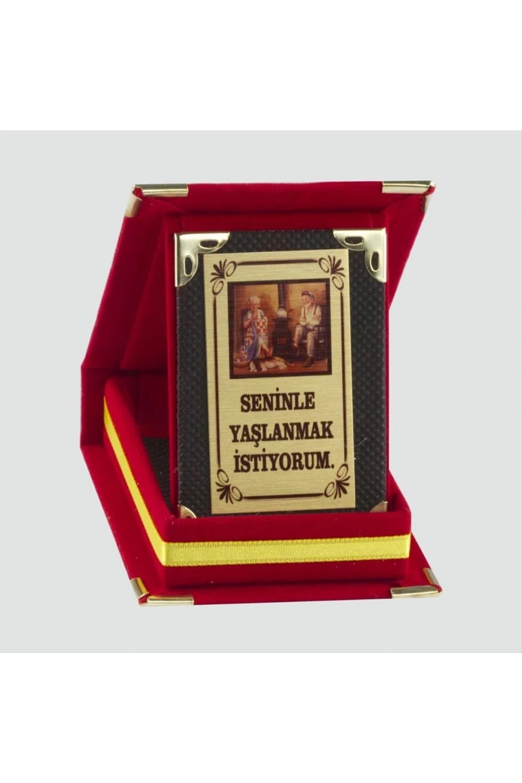 Süet kutulu plaket, metal üzerine yazı yazılarak üretilmiştir, ölçüleri kurulu vaziyette; yükseklik: 11cm, genişlik: 8cm'dir. sevgililer günü hediyesi, sevgililer için hediye, sevgiliye özel hediye , en güzel sevgililer günü hediyesi, 14 şubat, aşkıma özel