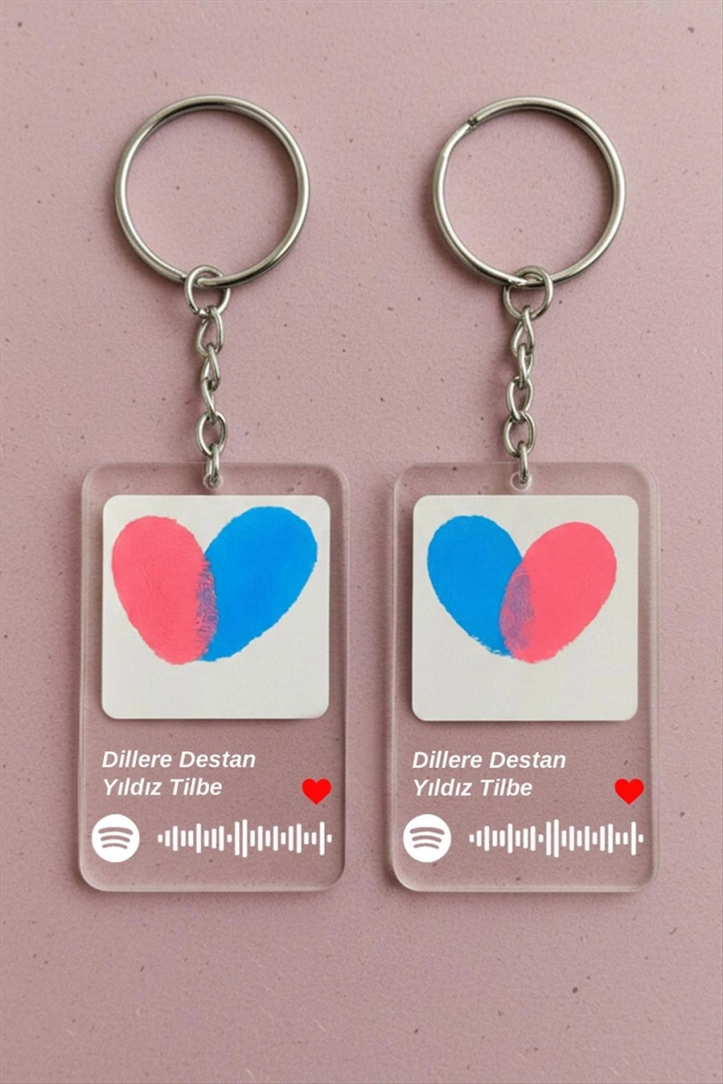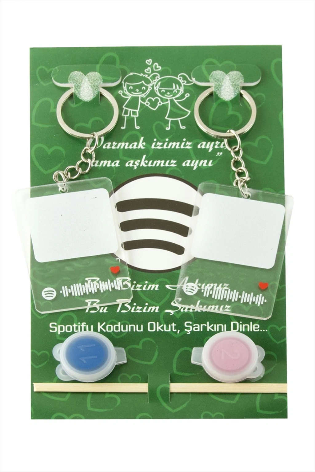 Parmak İzli Anahtarlık Yapma Seti; Ürün malzemesi metal ve plastiktir. Ürün paket içersinde 2 adet boya, 2 adet anahtarlık bulunmaktadır. Anahtarlık boyu 10 cmdir. Anahtarlık üzerinde yazılan şarkıların aynısı gönderilecektir. Ürün üzerindeki kodu okutarak şarkıya direk bağlanabilirsiniz.