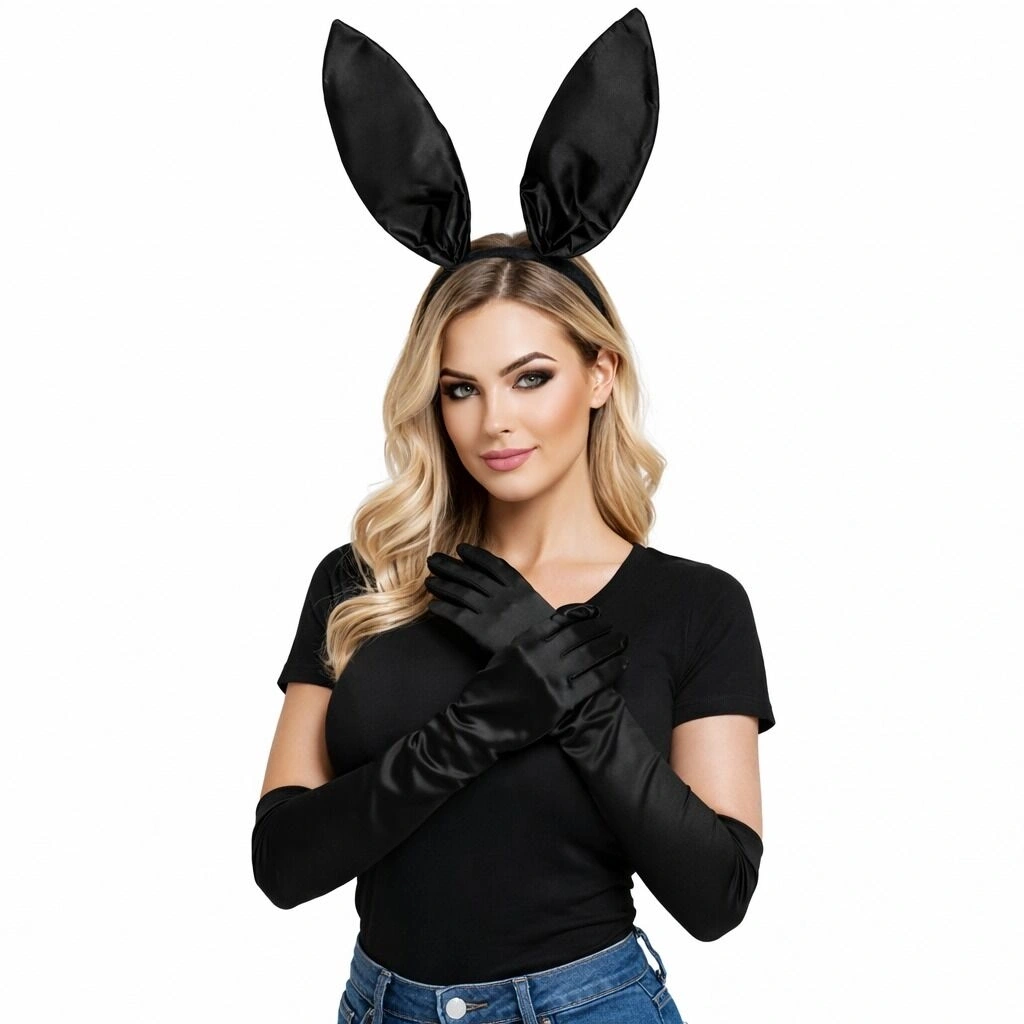 Şıklığı ve dikkat çekici tasarımı bir arada sunan Siyah Saten Tavşan Kulak ve Eldiven Kostüm Seti, parti ve özel organizasyonlar için mükemmel bir tercihtir.