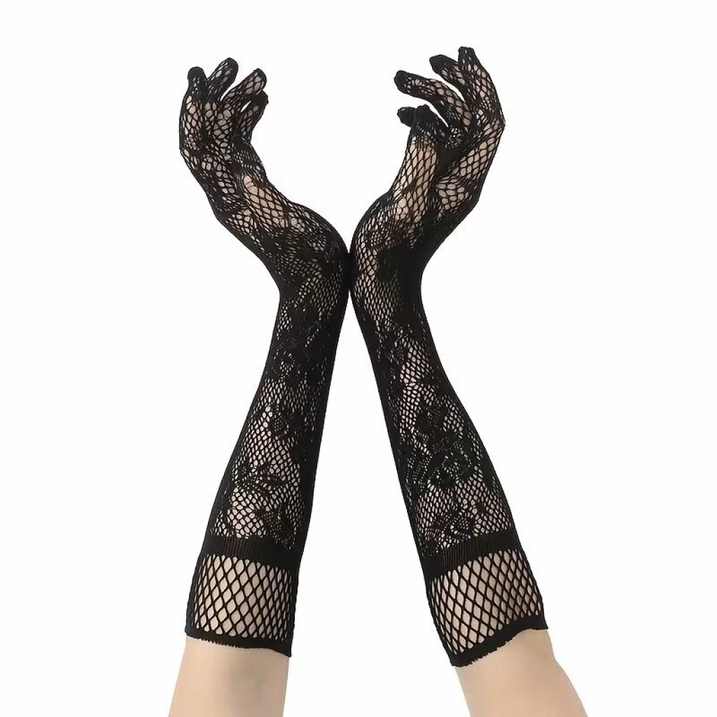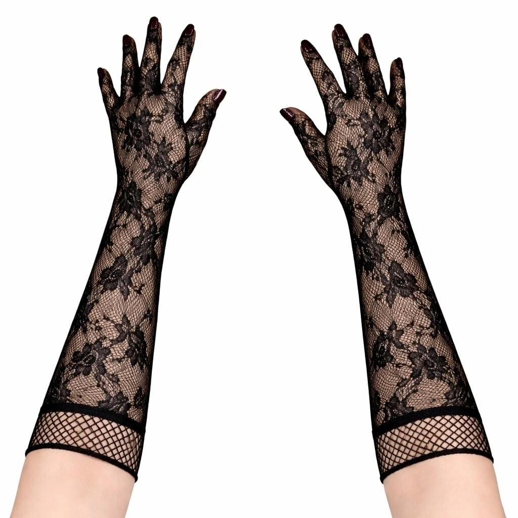 Siyah Uzun Gül Desenli Dantel Kadın Eldiveni