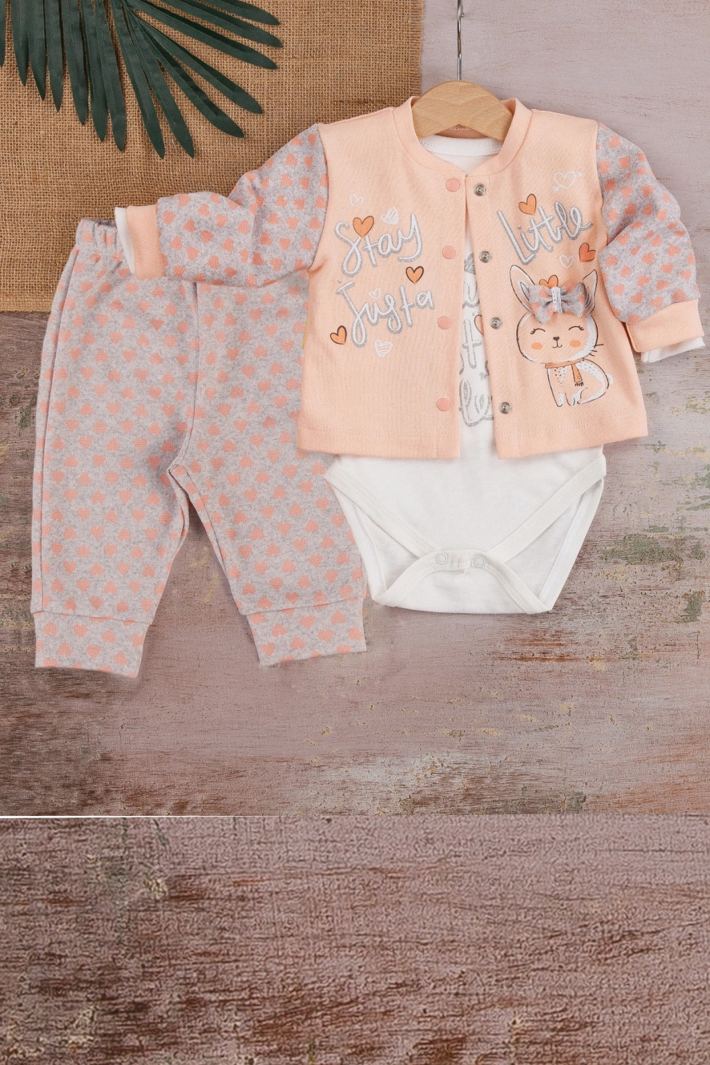 Kalp Baskılı Fisto Yaka 3 Parça Kız Bebek Takımı %100 Pamuk