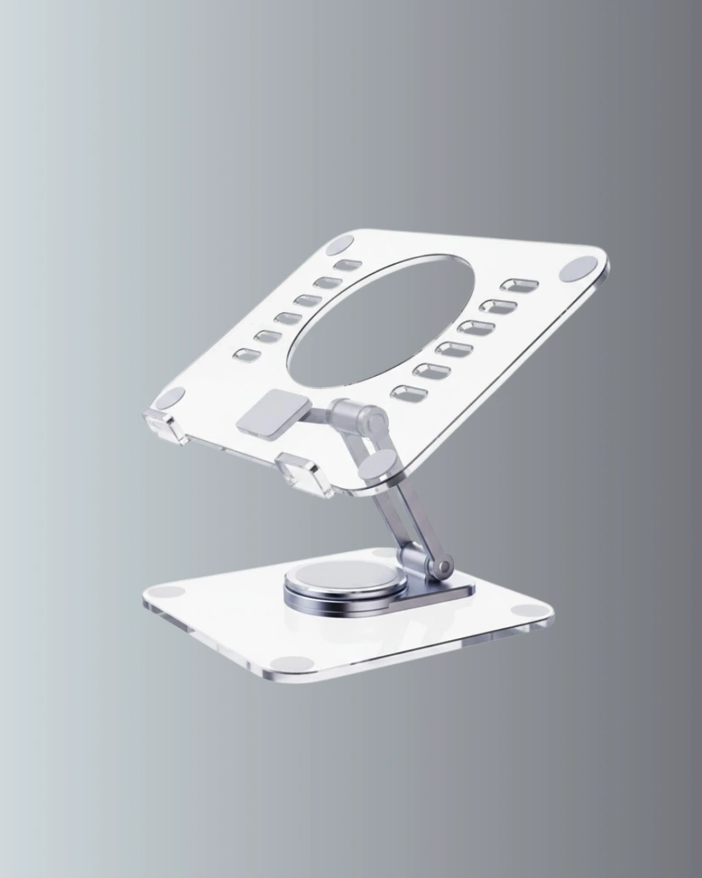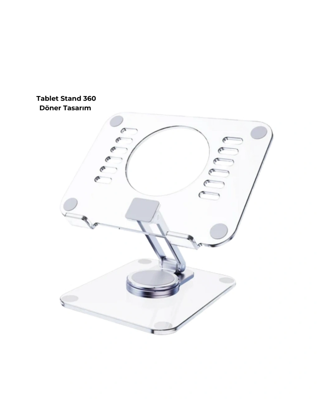 Katlanabilir tablet standı, hem ev hem de iş ortamları için tasarlanmıştır. Şeffaf tasarımı modern bir görünüm sunarken, ayarlanabilir yapısı farklı kullanım ihtiyaçlarına uyum sağlar. Isı dağılımını destekleyen açık yapısı ve kaymaz silikon tabanı ile güvenli ve pratik bir kullanım sunar. Günlük kullanımda konfor ve taşınabilirlik arayanlar için ideal bir üründür.