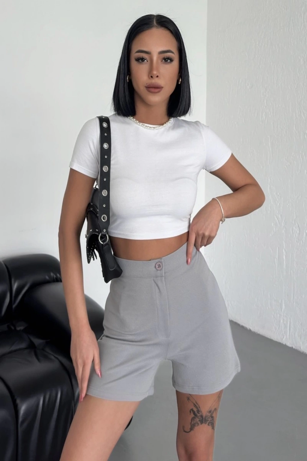 -Yazın ferahlatıcı tonlarını ve rahatlığını üzerinizde hissetmek istiyorsanız, gri yüksek bel esnek likralı krep şort tam size göre! Tarzınızı ve konforunuzu bir arada yaşamak için bu şortu gardırobunuza ekleyin ve yazın keyfini çıkarın.