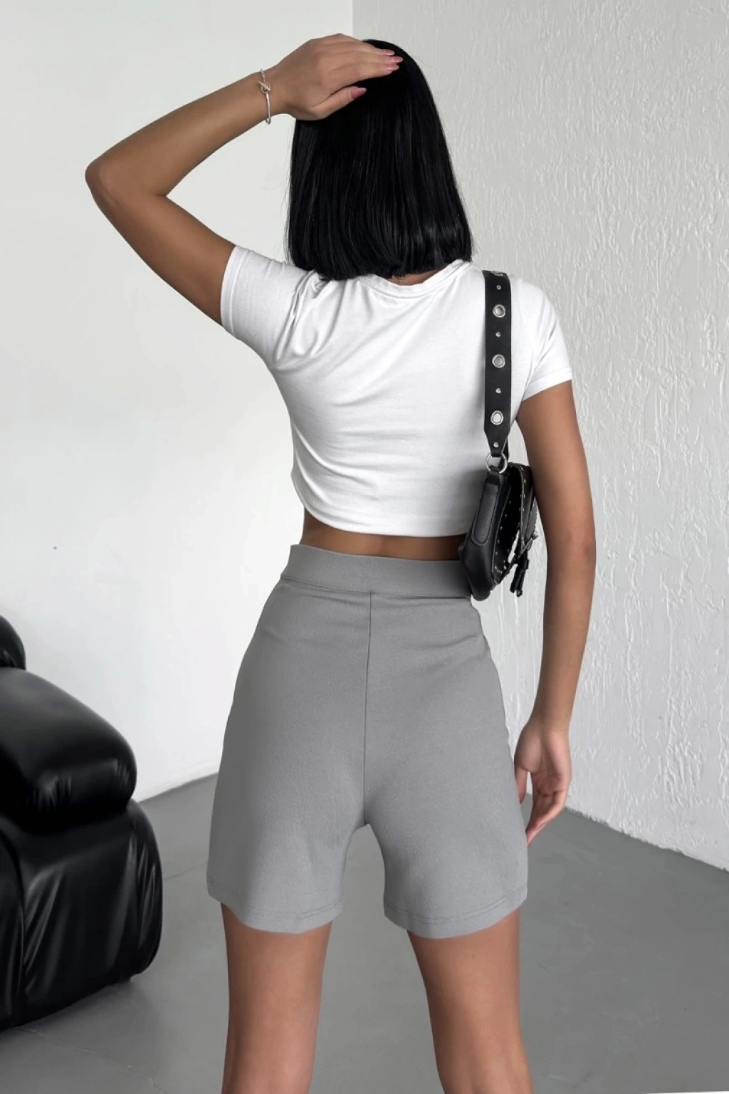 -Yazın serin rüzgarlarını hissetmek isteyenler için tasarlanan gri yüksek bel esnek likralı krep şort, hafifliği ve rahatlığı bir arada sunuyor! Likralı kumaşı, hareket özgürlüğünüzü kısıtlamadan gün boyu konfor sağlarken, gri rengiyle ferahlık ve tarzı birleştiriyor.