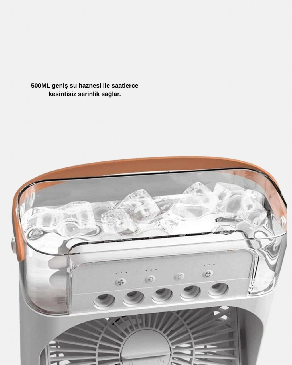Sıcak yaz günlerinde serinlemenin en pratik yolu!Bu çok fonksiyonlu mini klima fanı, sadece bir fan değil; aynı zamanda hava soğutucu, nemlendirici ve gece lambası olarak kullanılabilir.3 kademeli rüzgar hızı ve 3 farklı püskürtme modu sayesinde istediğiniz serinlik ve nem seviyesini kolayca ayarlayabilirsiniz.500 ml geniş su haznesi, uzun süreli serinlik sağlar; ofis, yatak odası, kamp veya piknik gibi ortamlarda rahatlıkla kullanılabilir.USB bağlantısı sayesinde bilgisayar, powerbank veya araç şarjı gibi farklı kaynaklardan enerji alabilir.7 renkli LED gece lambası modu, ortama yumuşak bir atmosfer katar ve dekoratif bir görünüm sunar.Sessiz çalışan motoru (45–50 dB) ile gürültüsüz bir ortamda keyifli bir serinlik sağlar.Düşük enerji tüketimiyle çevre dostu ve ekonomik bir çözümdür.Taşınabilir yapısı sayesinde yazın her an serin kalmak artık çok kolay!