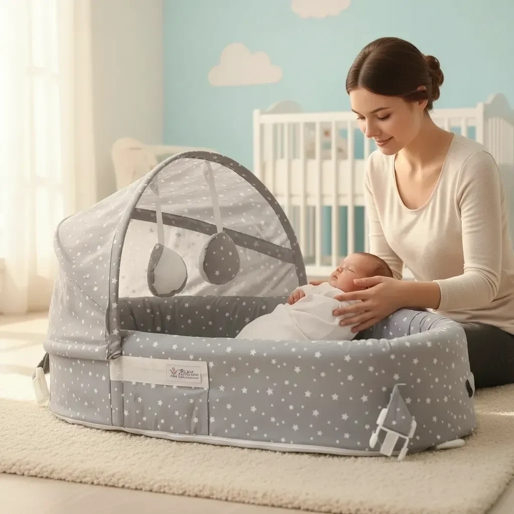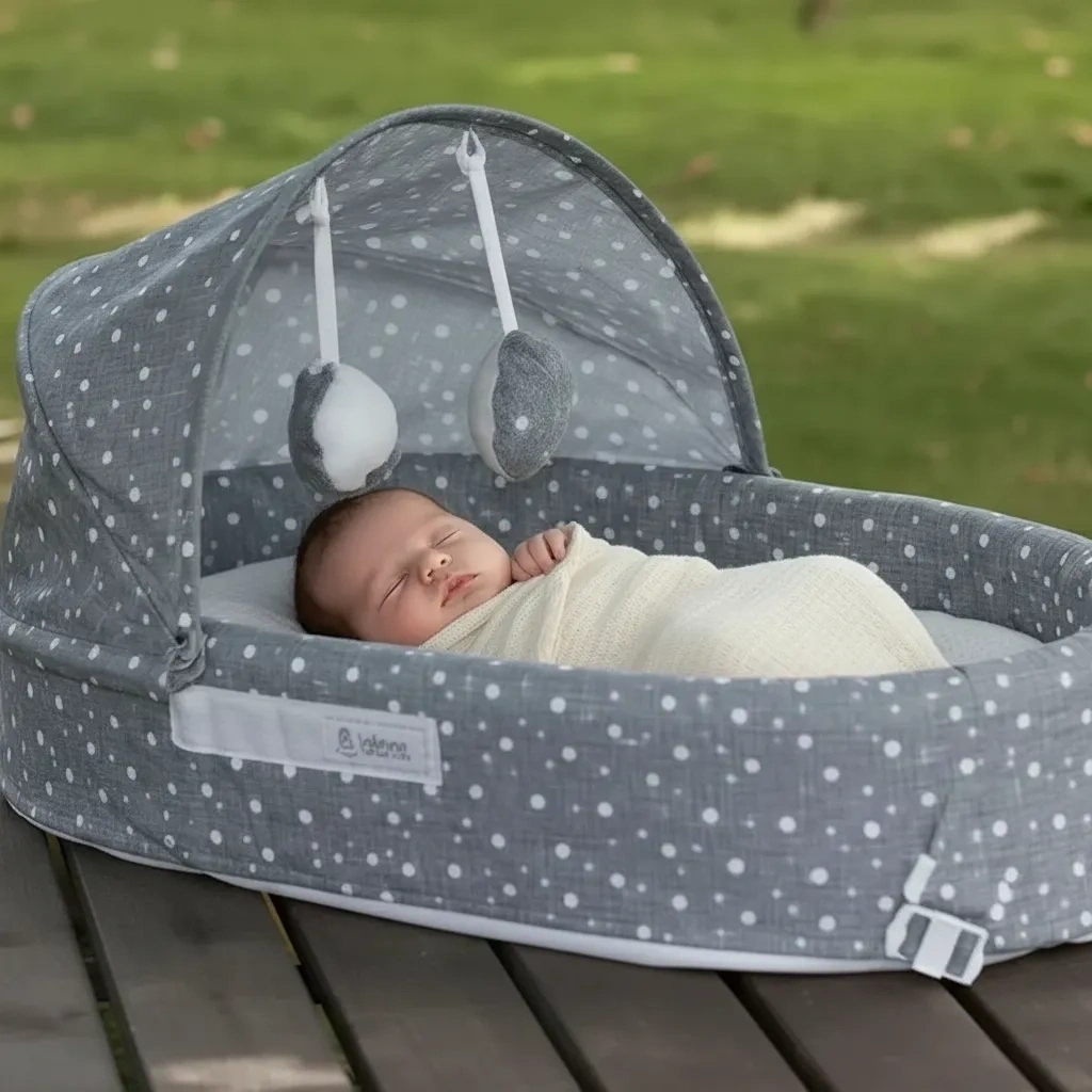 Taşınabilir Portatif Bebek Yatağı,Sırt Çantasına Dönüşebilen Portatif Bebek Beşiği (Gri)