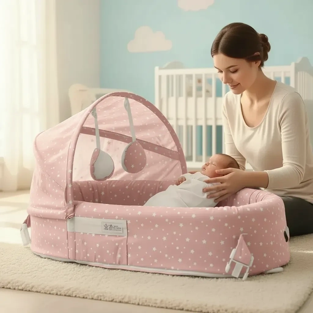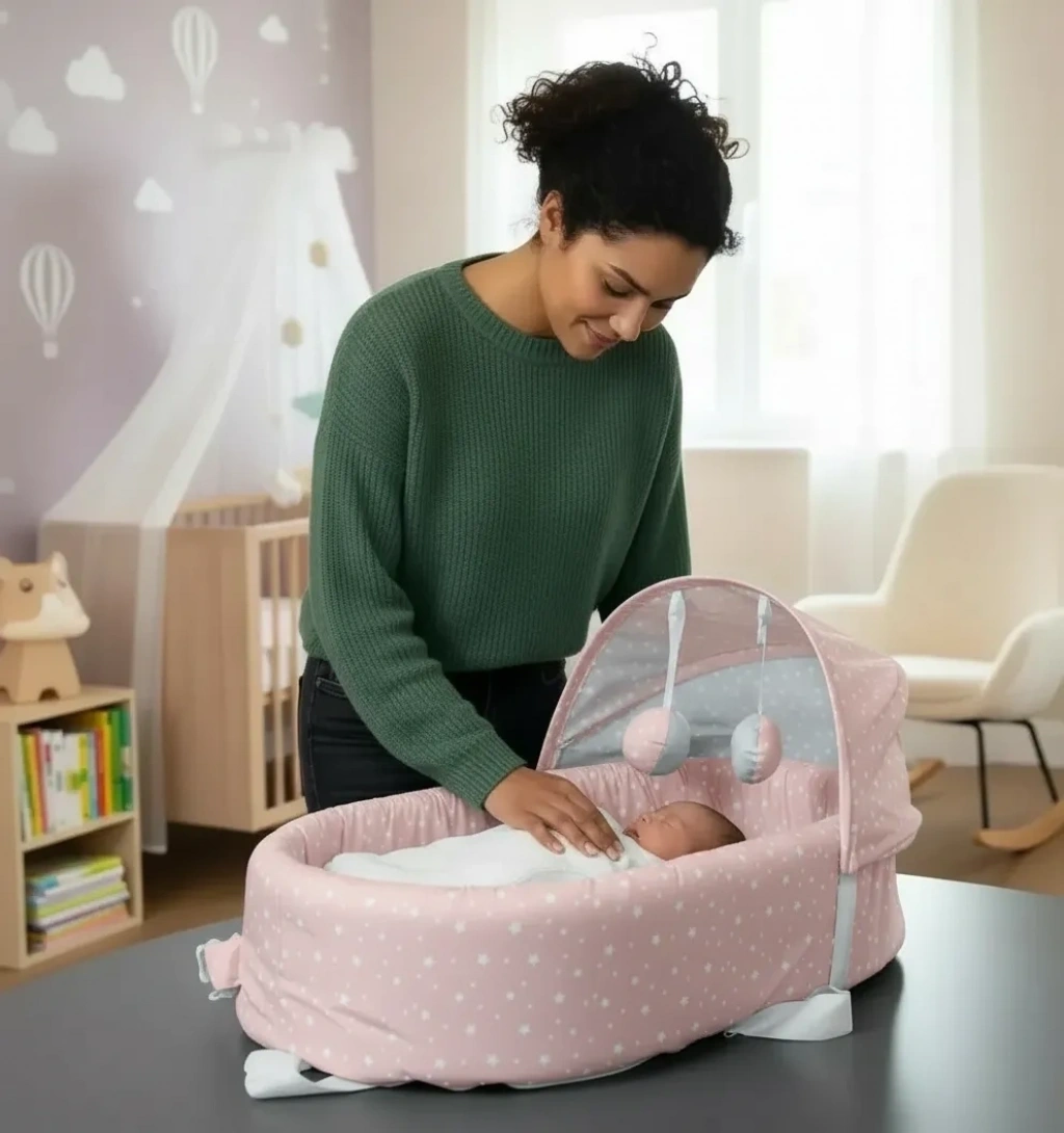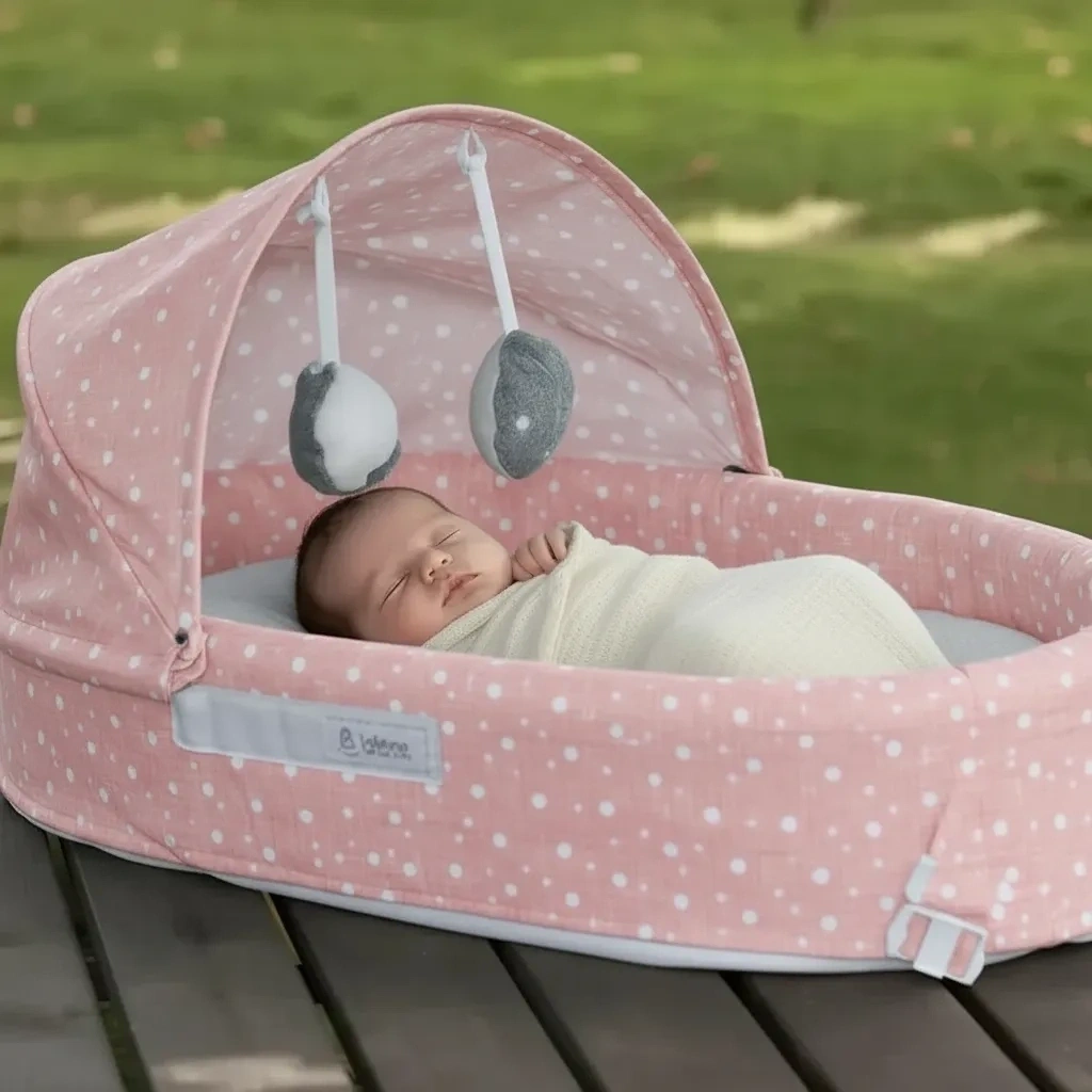 Taşınabilir Portatif Bebek Yatağı,Sırt Çantasına Dönüşebilen Portatif Bebek Beşiği (Pembe)
