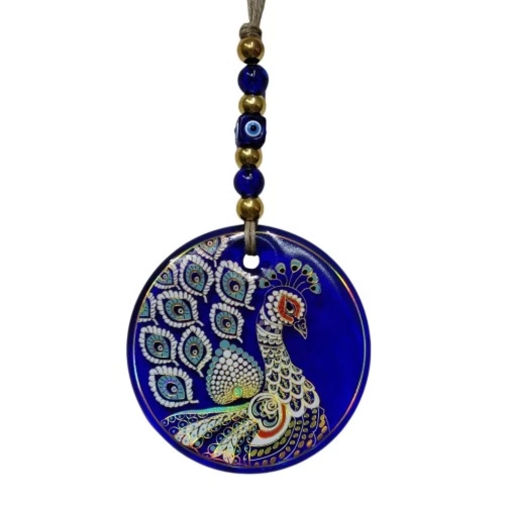Tavus kuşu şekilli duvar süsümüz nazar boncuğu ile süslenmiştir. Ürünümüz mavi cam nazar boncuğu kullanılarak el işçiliği ile üretilmiştir. Ürünümüzün yuvarlak kısmı 13 santimetre çapındadır. Duvar süsümüz ip dahil yaklaşık 30 santimetre boyundadır.