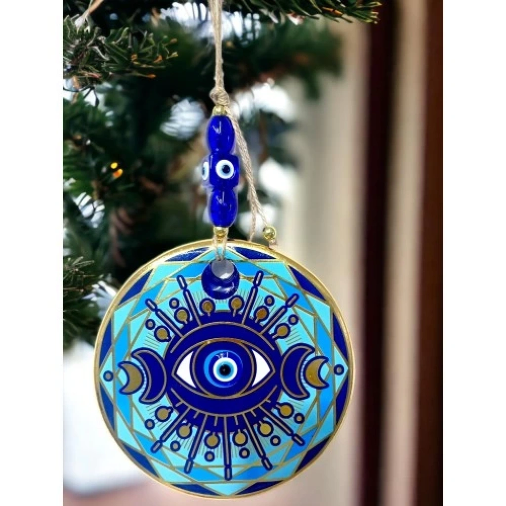 Nazar boncuklu göz duvar süsümüz nazar boncuğu ile süslenmiştir. Ürünümüz mavi cam nazar boncuğundan tamamen el işçiliği ile üretilmiştir. Ürünümüzün yuvarlak kısmı 13 santimetre çapındadır. Duvar süsümüz ip dahil yaklaşık 30 santimetre boyundadır.