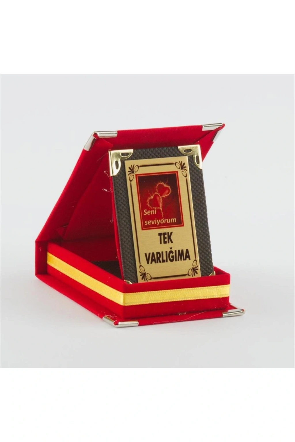 Süet kutulu plaket, metal üzerine yazı yazılarak üretilmiştir, ölçüleri kurulu vaziyette; yükseklik: 11cm, genişlik: 8cm'dir. sevgililer günü hediyesi, sevgililer için hediye, sevgiliye özel hediye , en güzel sevgililer günü hediyesi, 14 şubat, aşkıma özel