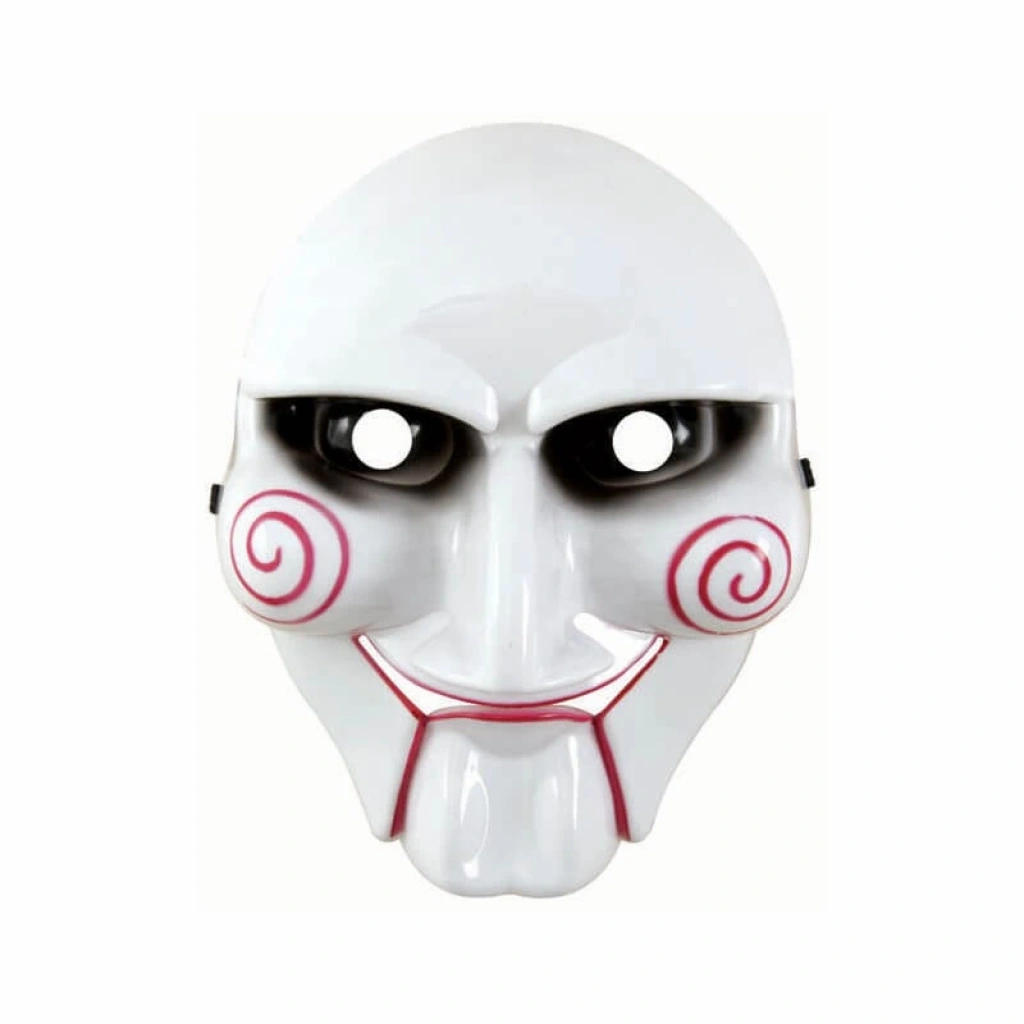 Yetişkinler ve Çocuklar için Parçalı maske siyah elastik sert plastik ve yapışması yapılmıştır. Siyah göz bölgesi, kırmızı ağız bölgesi ve yanaklarda kırmızı spirallerle beyazdır. Bu testere maskesi bir kukla kafasına benziyor, bir Cadılar Bayramı partisi için orijinal bir şekilde giyinmek için mükemmel .