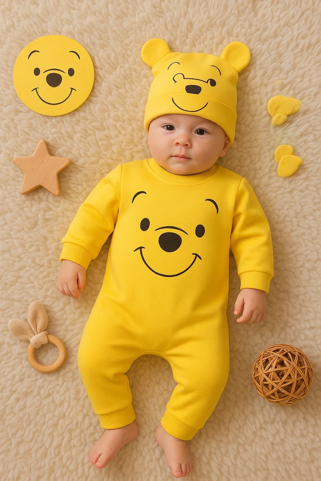 The Bear Desenli % 100 Pamuk Şapkalı Tulum