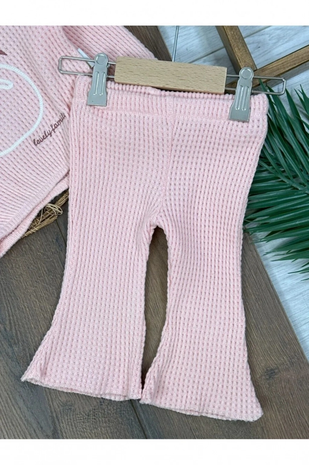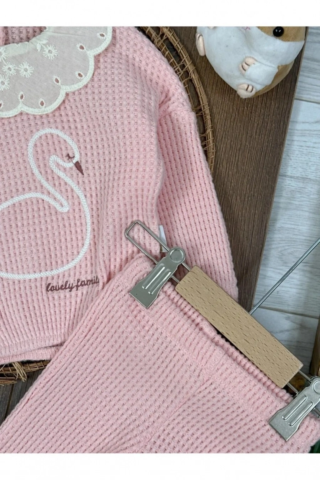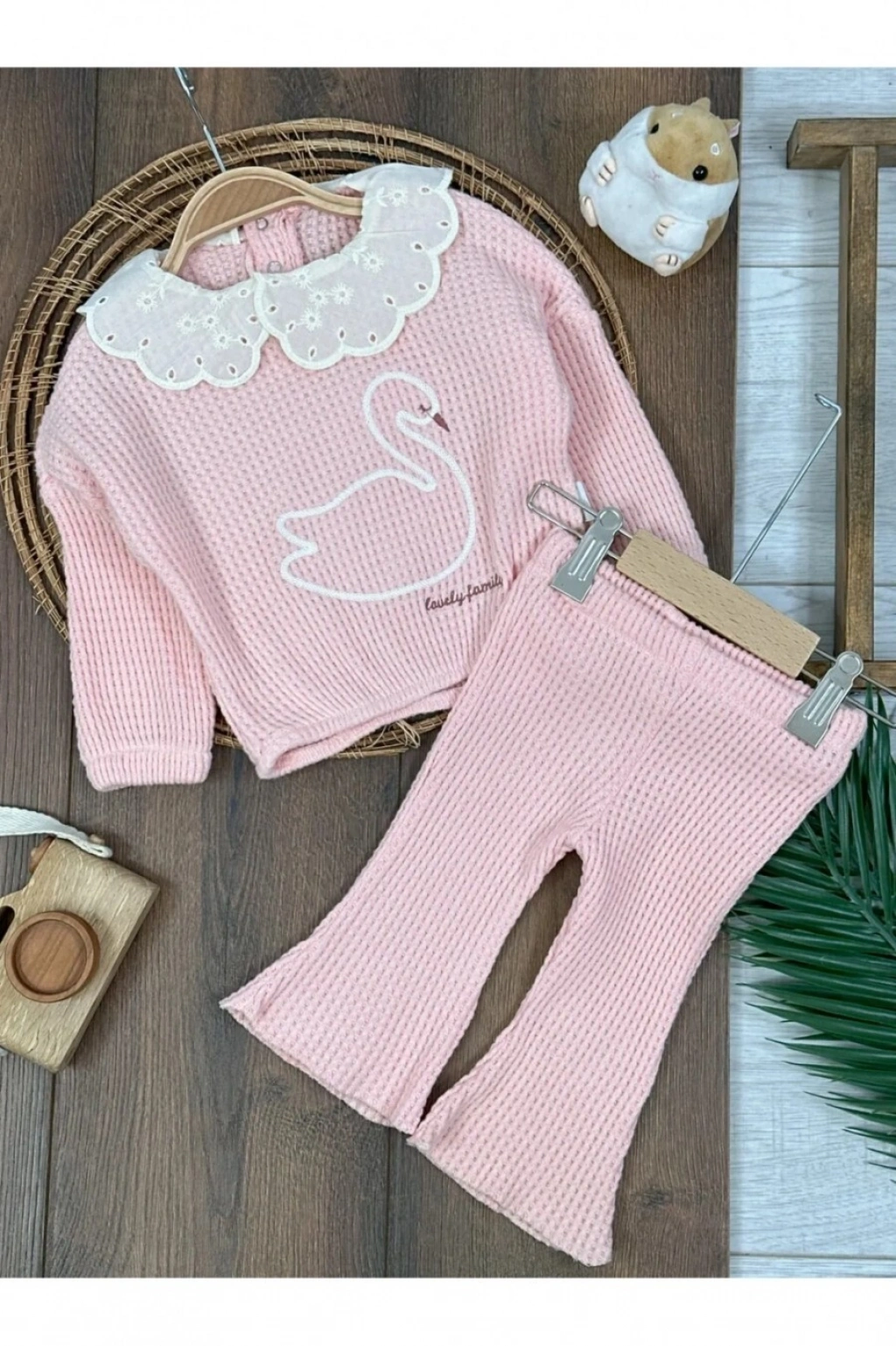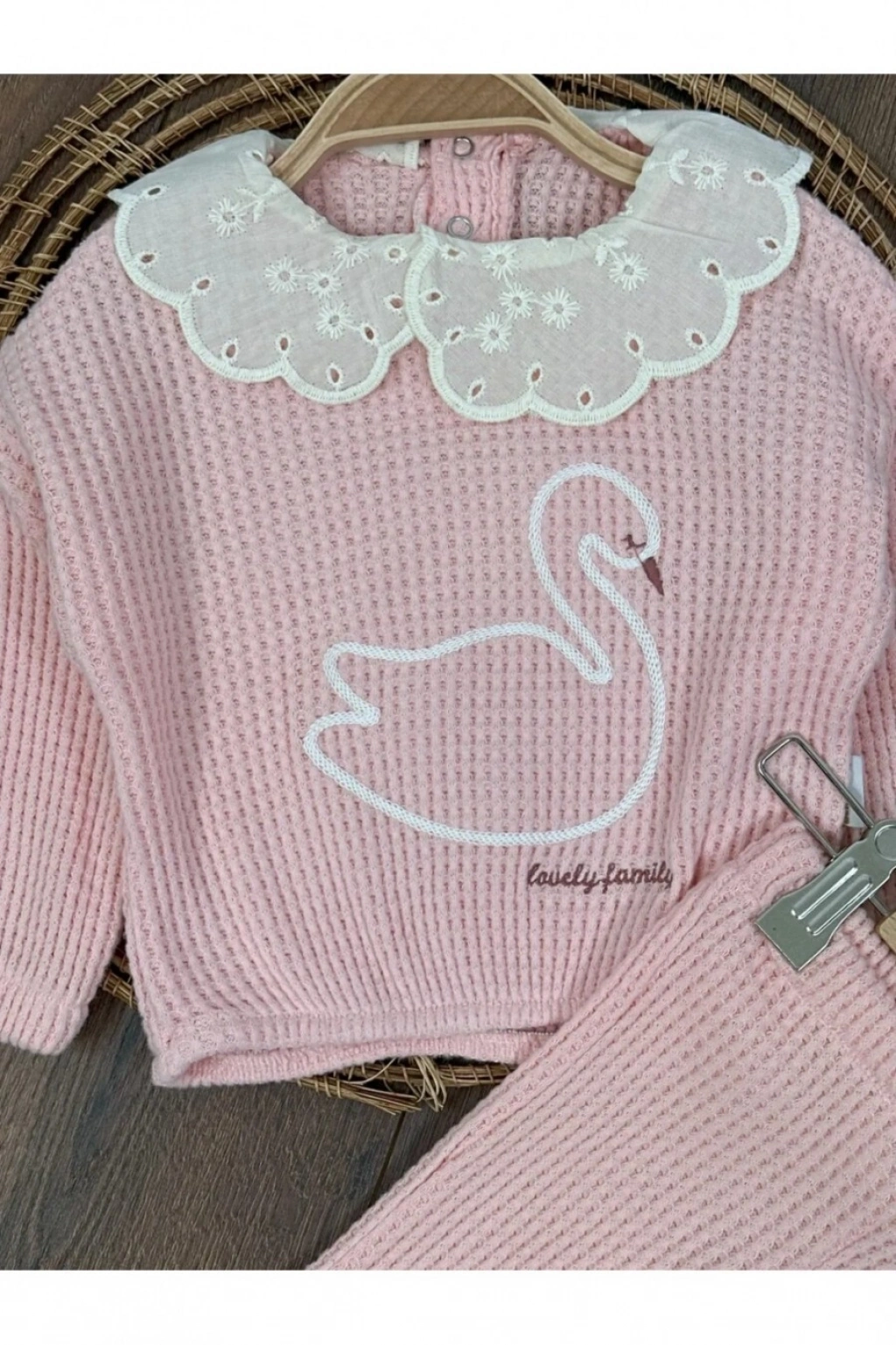 Triko Pudra pembe süzene nakışlı yaka güpürlü ispanyol paça pamuklu kız bebek takım