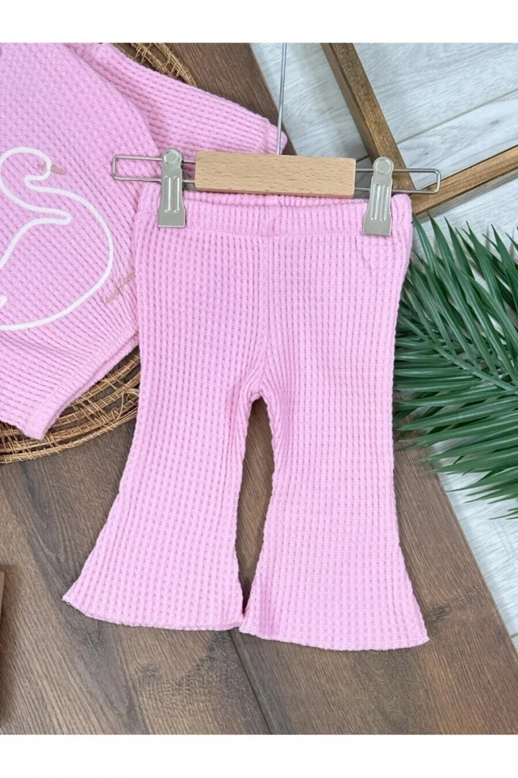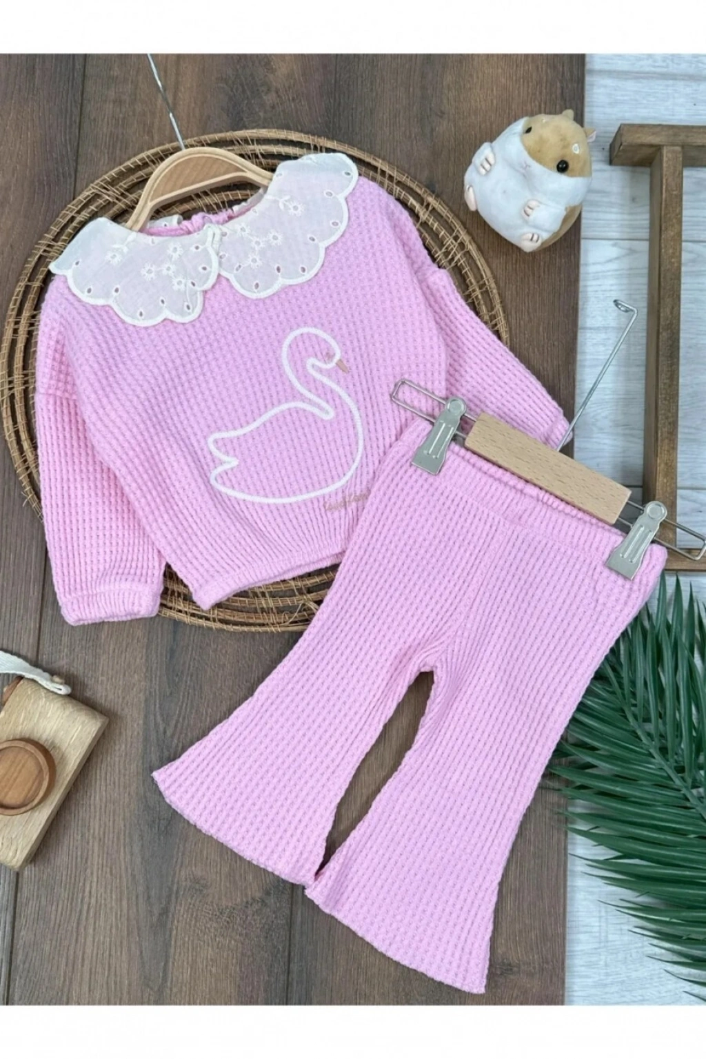 Triko Şeker Pembe Süzene nakışlı yaka güpürlü ispanyol paça pamuklu kız bebek takım