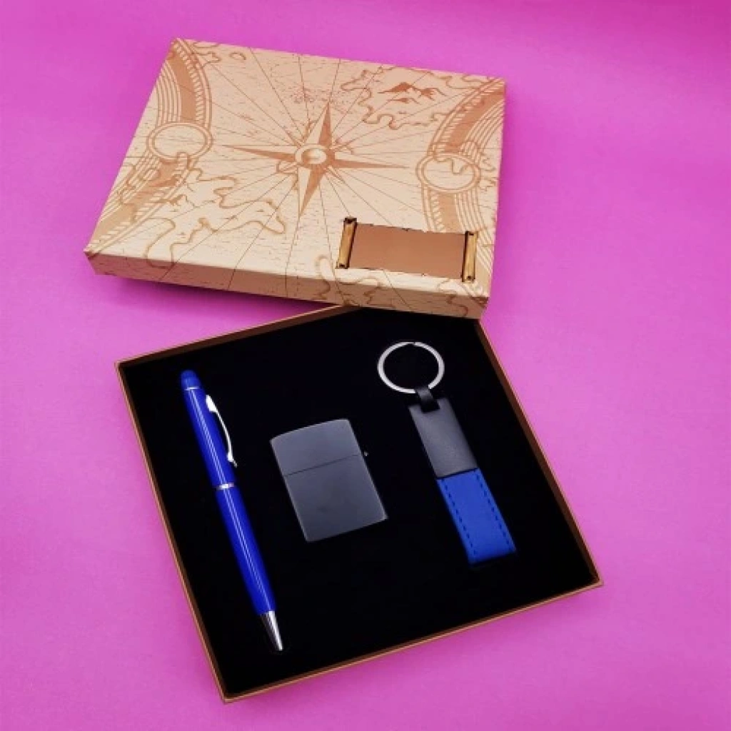 Tükenmez Kalem Çakmak Anahtarlık SetiTükenmez kalem, çakmak ve anahtarlıktan oluşan bu özel hediye seti, şık tasarımı ve dikkat çeken görünümüyle hem kişiye özel hem de promosyon amaçlı sunulabilecek en zarif setlerden biridir. Özel tasarım kutusuyla gelen set, mavi kalem, anahtarlık ve mat siyah çakmak kombinasyonuyla modern ve etkileyici bir hediye sunar.Kutusu sayesinde dilediğiniz gibi süsleyebilir ve içerisine küçük notlar veya mini hediyeler ekleyerek daha anlamlı hale getirebilirsiniz. Set içerisinde yer alan ürünlerin tamamı kaliteli malzemeden üretilmiş olup hem şık hem de kullanışlıdır. İş dünyasında, özel günlerde veya kişiye özel armağan olarak tercih edilebilecek ideal bir hediye setidir.Lazer baskı, lazer kazıma gibi yöntemlerle çakmak, kalem ve anahtarlık üzerine isim, logo veya özel mesaj eklenebilir. Bu sayede seti tamamen kişiye özel bir hediyeye dönüştürebilirsiniz.Tükenmez Kalem – Çakmak – Anahtarlık Seti Özellikleri:Özel tasarım kutuda gönderilir.Mavi tükenmez kalem modern ve şık görünüme sahiptir.Mat siyah çakmak dikkat çekici tasarımdadır.Anahtarlık kaliteli malzemeden üretilmiştir.Ürünlerin tamamı kişiye özel baskıya uygundur.Hediye, promosyon veya kurumsal kullanım için idealdir.Kutunun içi düzenli ve estetik şekilde tasarlanmıştır.